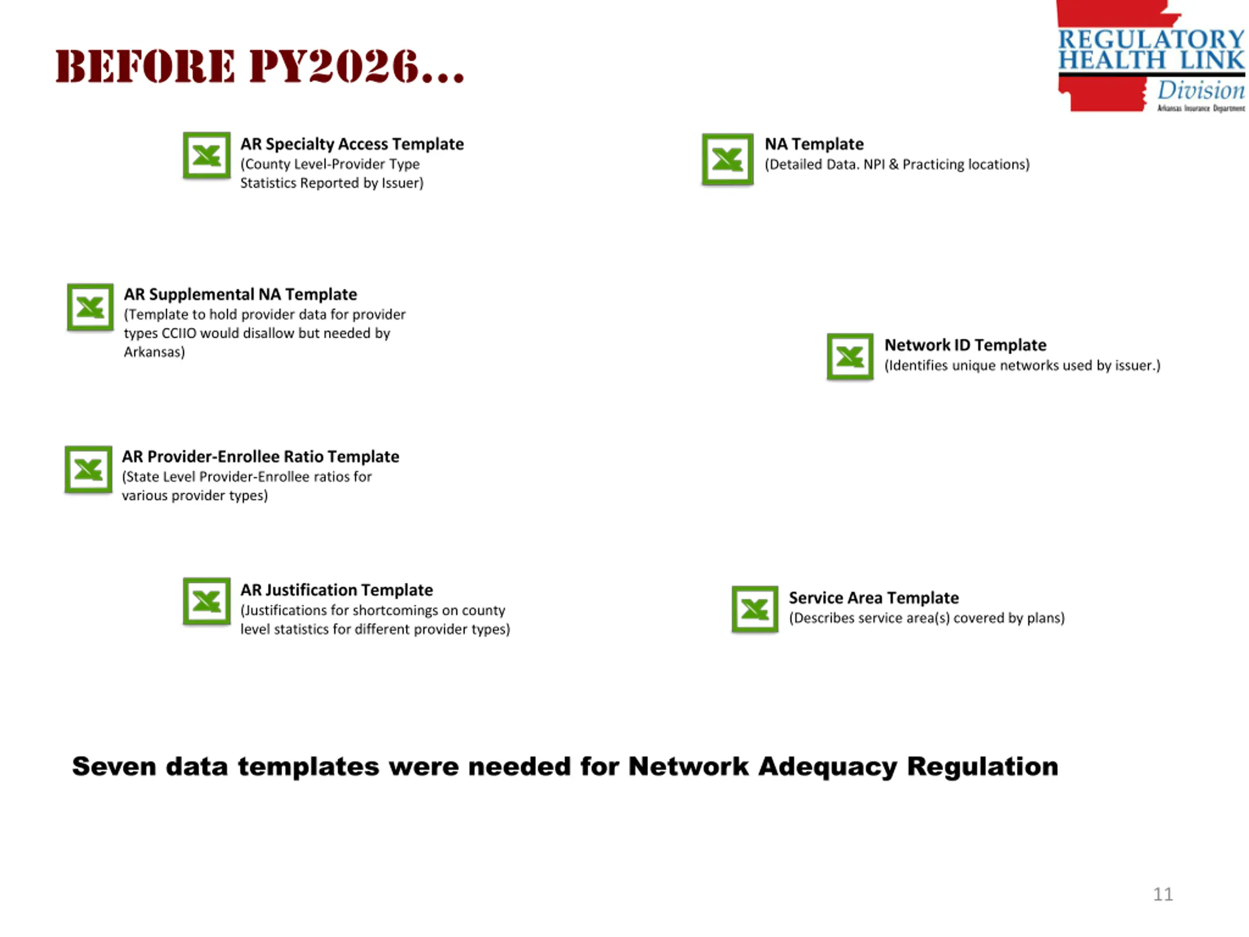 Before PY2026 AR Specialty Access Template (County Level-Provider Type Statistics Reported by Issuer) NA Template (Detailed Data. NPI & Practicing locations) AR Supplemental NA Template (Template to hold provider data for provider types CCIIO would disallow but needed by Arkansas) Network ID Template (Identifies unique networks used by issuer.) AR Provider-Enrollee Ratio Template (State Level Provider-Enrollee ratios for various provider types) AR Justification Template (Justifications for shortcomings on county level statistics for different provider types) Service Area Template (Describes service area(s) covered by plans) Seven data templates were needed for Network Adequacy Regulation 11