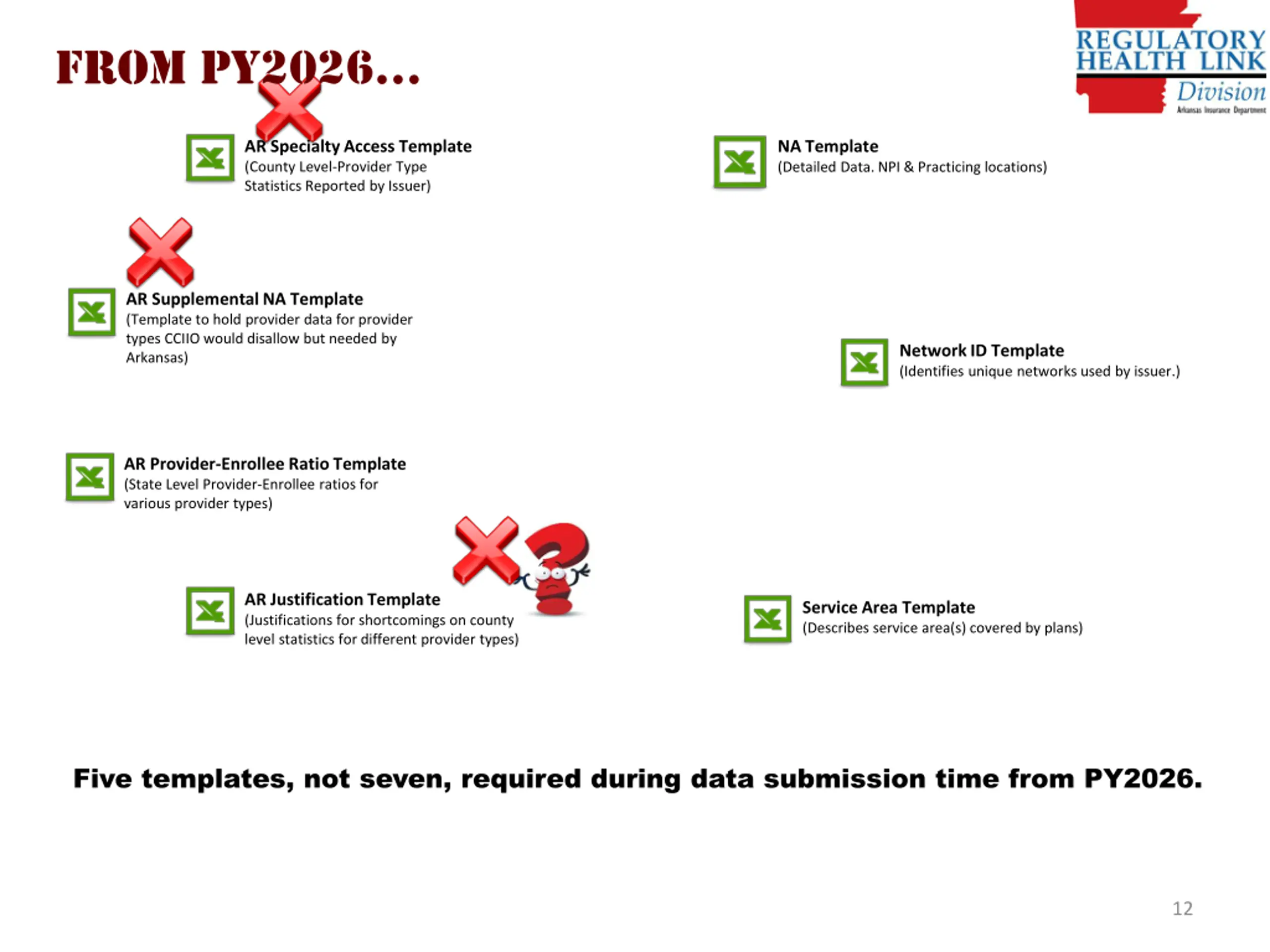 from PY2026 AR Specialty Access Template (County Level-Provider Type Statistics Reported by Issuer) NA Template (Detailed Data. NPI & Practicing locations) AR Supplemental NA Template (Template to hold provider data for provider types CCIIO would disallow but needed by Arkansas) Network ID Template (Identifies unique networks used by issuer.) AR Provider-Enrollee Ratio Template (State Level Provider-Enrollee ratios for various provider types) AR Justification Template (Justifications for shortcomings on county level statistics for different provider types) Service Area Template (Describes service area(s) covered by plans) Five templates, not seven, required during data submission time from PY2026. 12