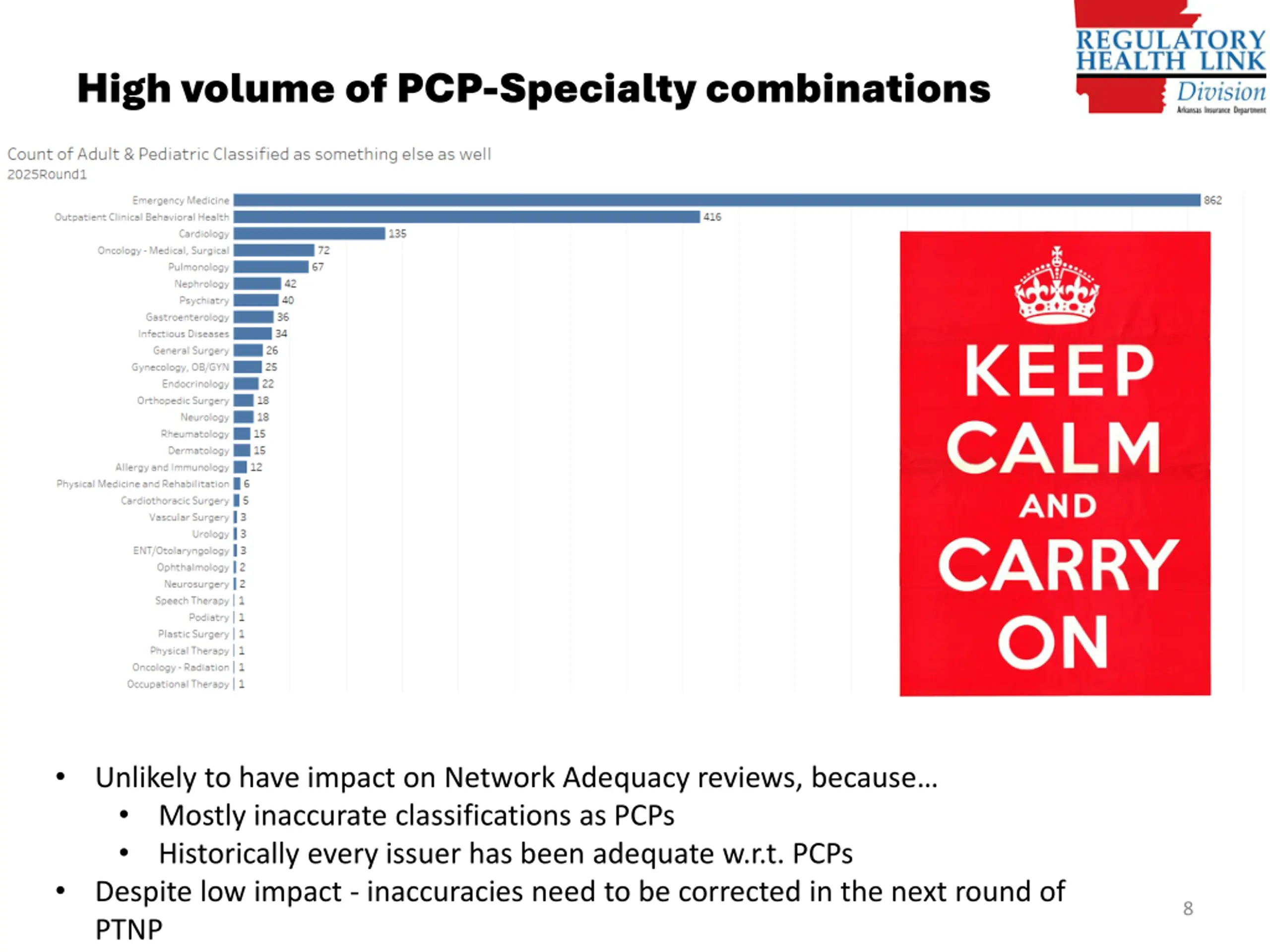 High volume of PCP-Specialty combinations Unlikely to have impact on Network Adequacy reviews, because Mostly inaccurate classifications as PCPs Historically every issuer has been adequate w.r.t. PCPs Despite low impact - inaccuracies need to be corrected in the next round of PTNP 8