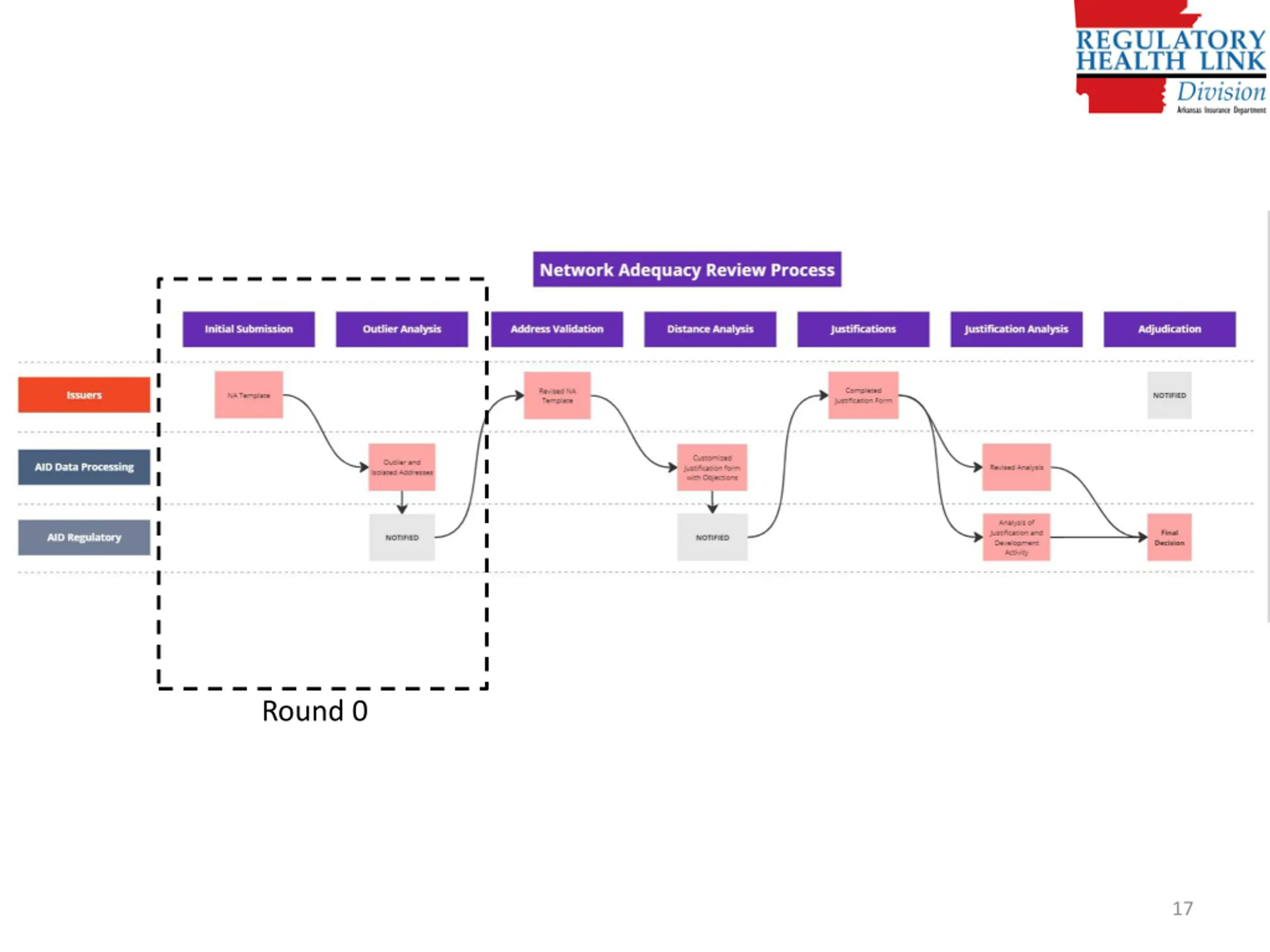 After data submissions Round 0: AID identifies outlier addresses and shares with issuers. Issuers responds with revised NA templates if required. Round 1: AID computes ideal network combining all networks. This is necessary for generating objections where improvement is possible. This also means No providers available is not a valid answer. AID computes individual networks and compares to ideal network to generate customized Justification Templates. Issuers responds with revised NA templates if required. Round 2: For final dispositions, AID re-computes individual networks for for issuers who resubmitted NA templates at the end of Round 1 18