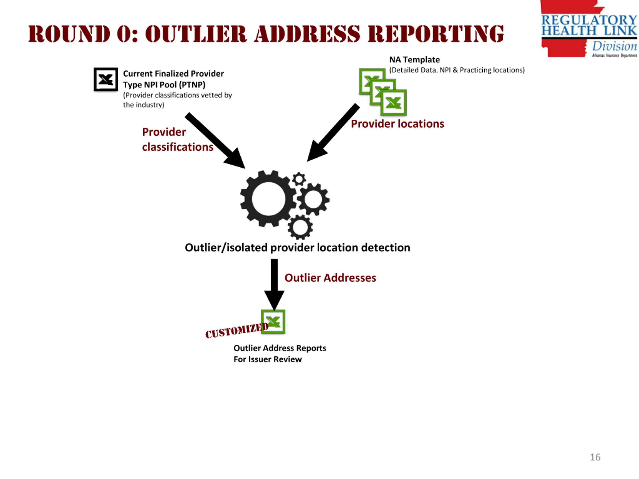Processes after data submissions Round 0: AID identifies outlier addresses and shares with issuers. Issuers responds with revised NA templates if required. Round 1: AID computes ideal network combining all networks. This is necessary for generating objections where improvement is possible. This also means No providers available is not a valid answer. AID computes individual networks and compares to ideal network to generate customized Justification Templates. Issuers responds with revised NA templates if required. Round 2: For final dispositions, AID re-computes individual networks for for issuers who resubmitted NA templates at the end of Round 1 15