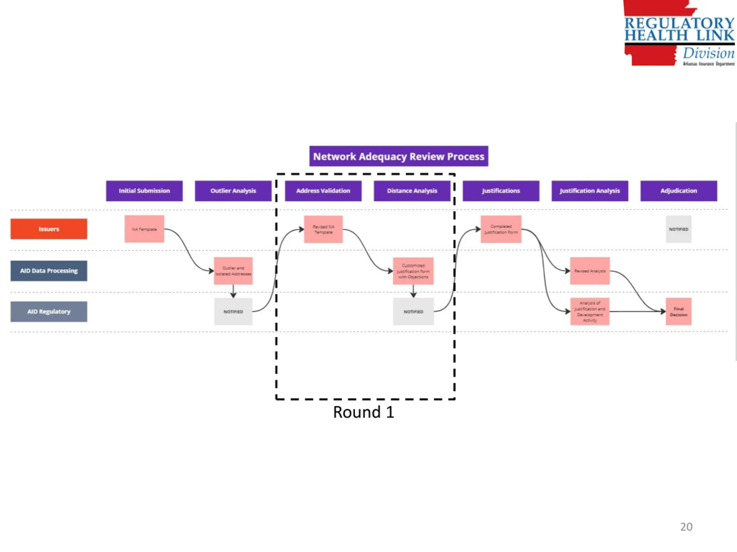 round 1: AIds na Computation NA Template (Detailed Data. NPI & Practicing locations) Current Finalized Provider Type NPI Pool (PTNP) (Provider classifications vetted by the industry) Provider locations Provider classifications Consumer locations QHP Sample Population file (Provided by CCIIO.) CCIIO requirements CCIIO NA Drive Distance for each Provider Type & Medicare County type AID s Computation of coverage % Network Shortcomings AR Justification Template (Justifications for shortcomings on county level statistics for different provider types) 19