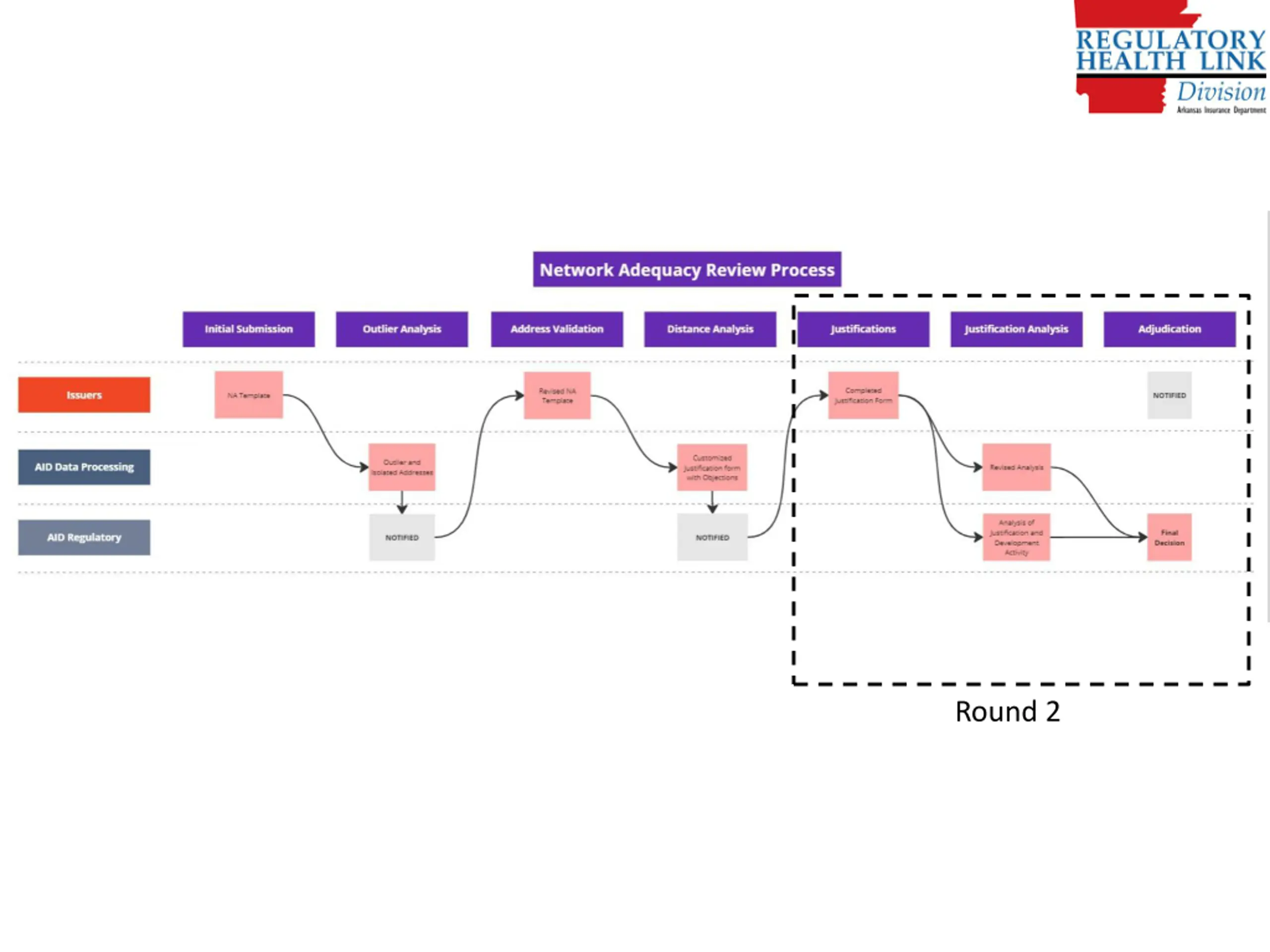 After data submissions Round 0: AID identifies outlier addresses and shares with issuers. Issuers responds with revised NA templates if required. Round 1: AID computes ideal network combining all networks. This is necessary for generating objections where improvement is possible. This also means No providers available is not a valid answer. AID computes individual networks and compares to ideal network to generate customized Justification Templates. Issuers responds with revised NA templates if required. Round 2: For final dispositions, AID re-computes individual networks for for issuers who resubmitted NA templates at the end of Round 1 21