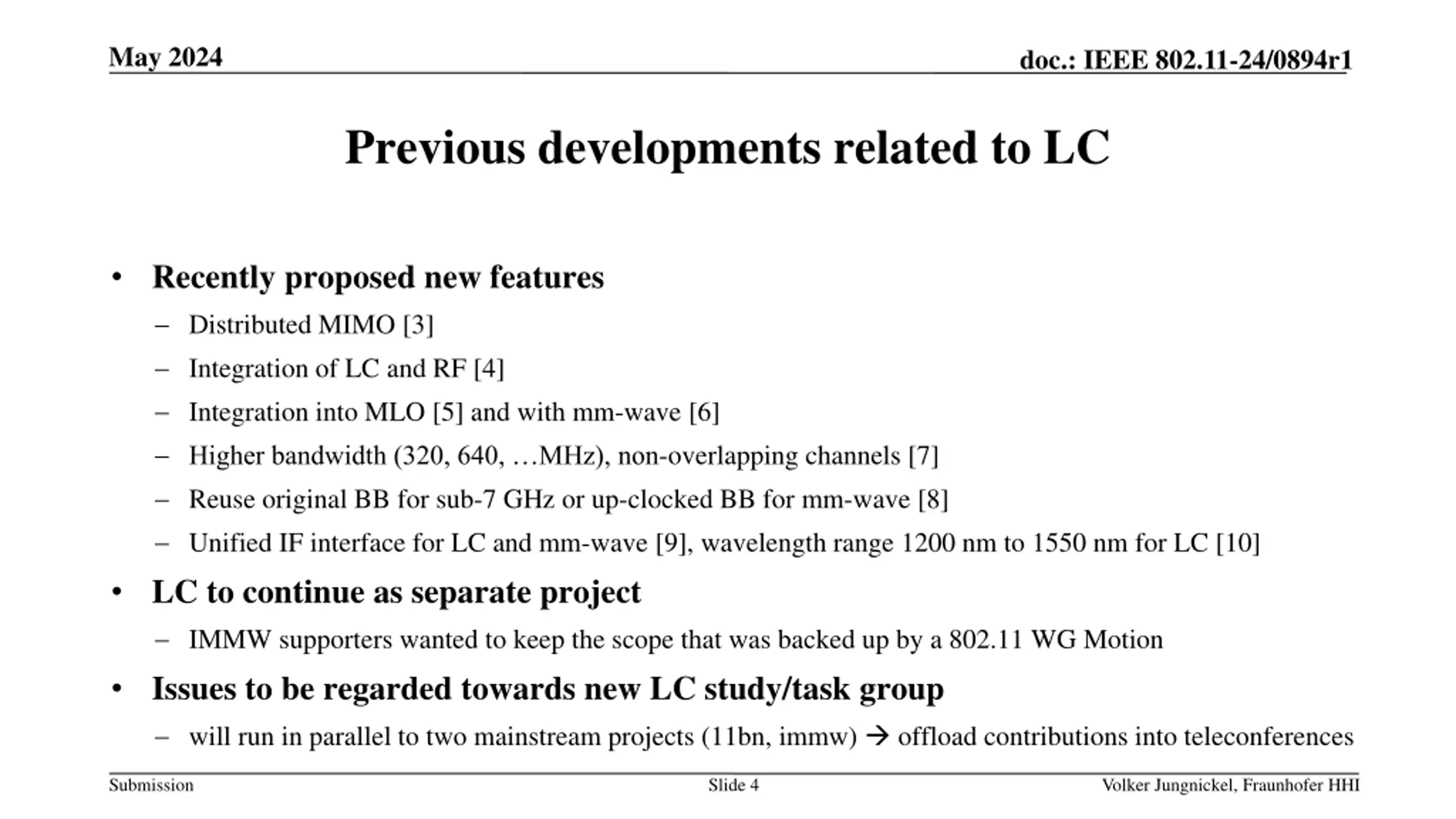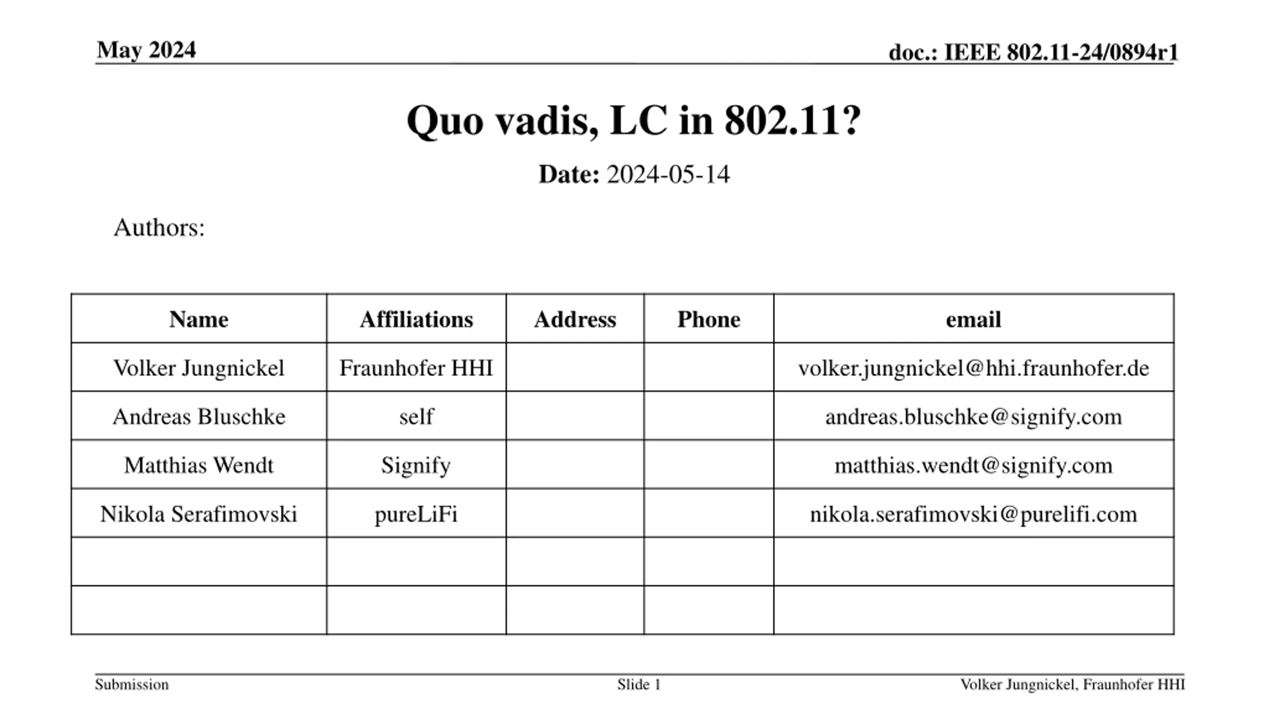 May 2024 doc.: IEEE 802.11-24/0894r1 Quo vadis, LC in 802.11? Date: 2024-05-14 Authors: Name Affiliations Address Phone email Volker Jungnickel Fraunhofer HHI volker.jungnickel@hhi.fraunhofer.de Andreas Bluschke self andreas.bluschke@signify.com Matthias Wendt Signify matthias.wendt@signify.com Nikola Serafimovski pureLiFi nikola.serafimovski@purelifi.com Submission Slide 1 Volker Jungnickel, Fraunhofer HHI