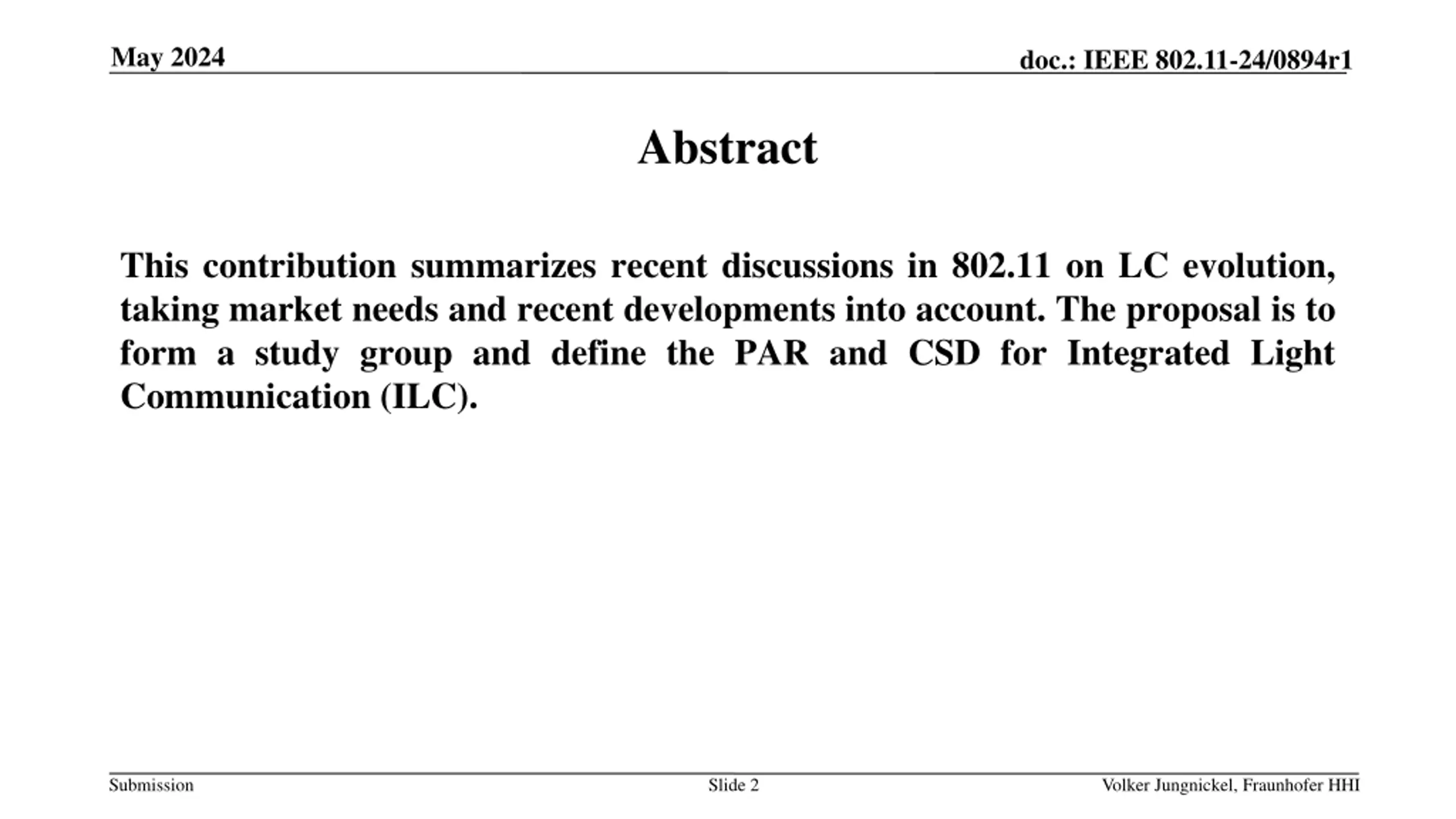 May 2024 doc.: IEEE 802.11-24/0894r1 Abstract This contribution summarizes recent discussions in 802.11 on LC evolution, taking market needs and recent developments into account. The proposal is to form a study group and define the PAR and CSD for Integrated Light Communication (ILC). Submission Slide 2 Volker Jungnickel, Fraunhofer HHI