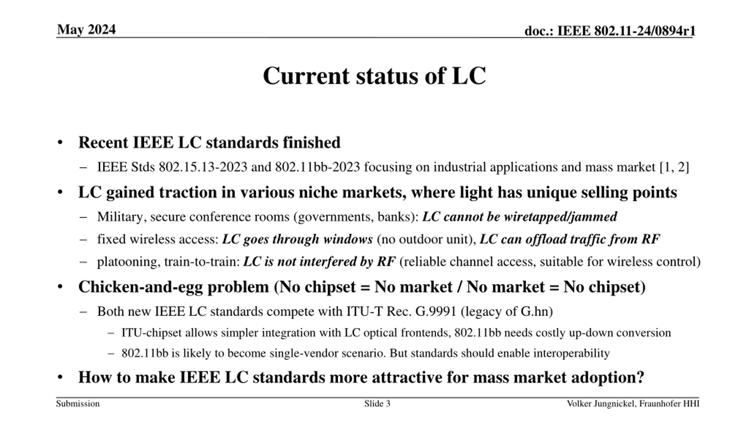 May 2024 doc.: IEEE 802.11-24/0894r1 Current status of LC Recent IEEE LC standards finished IEEE Stds 802.15.13-2023 and 802.11bb-2023 focusing on industrial applications and mass market [1, 2] LC gained traction in various niche markets, where light has unique selling points Military, secure conference rooms (governments, banks): LC cannot be wiretapped/jammed fixed wireless access: LC goes through windows (no outdoor unit), LC can offload traffic from RF platooning, train-to-train: LC is not interfered by RF (reliable channel access, suitable for wireless control) Chicken-and-egg problem (No chipset = No market / No market = No chipset) Both new IEEE LC standards compete with ITU-T Rec. G.9991 (legacy of G.hn) ITU-chipset allows simpler integration with LC optical frontends, 802.11bb needs costly up-down conversion 802.11bb is likely to become single-vendor scenario. But standards should enable interoperability How to make IEEE LC standards more attractive for mass market adoption? Submission Slide 3 Volker Jungnickel, Fraunhofer HHI