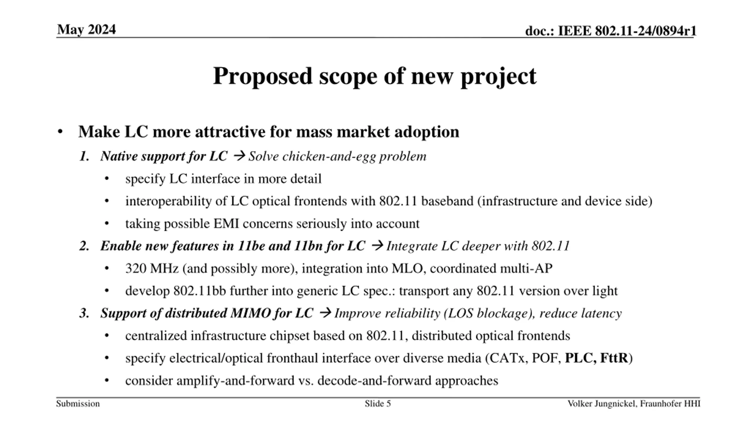 May 2024 doc.: IEEE 802.11-24/0894r1 Previous developments related to LC Recently proposed new features Distributed MIMO [3] Integration of LC and RF [4] Integration into MLO [5] and with mm-wave [6] Higher bandwidth (320, 640, MHz), non-overlapping channels [7] Reuse original BB for sub-7 GHz or up-clocked BB for mm-wave [8] Unified IF interface for LC and mm-wave [9], wavelength range 1200 nm to 1550 nm for LC [10] LC to continue as separate project IMMW supporters wanted to keep the scope that was backed up by a 802.11 WG Motion Issues to be regarded towards new LC study/task group will run in parallel to two mainstream projects (11bn, immw) offload contributions into teleconferences Submission Slide 4 Volker Jungnickel, Fraunhofer HHI
