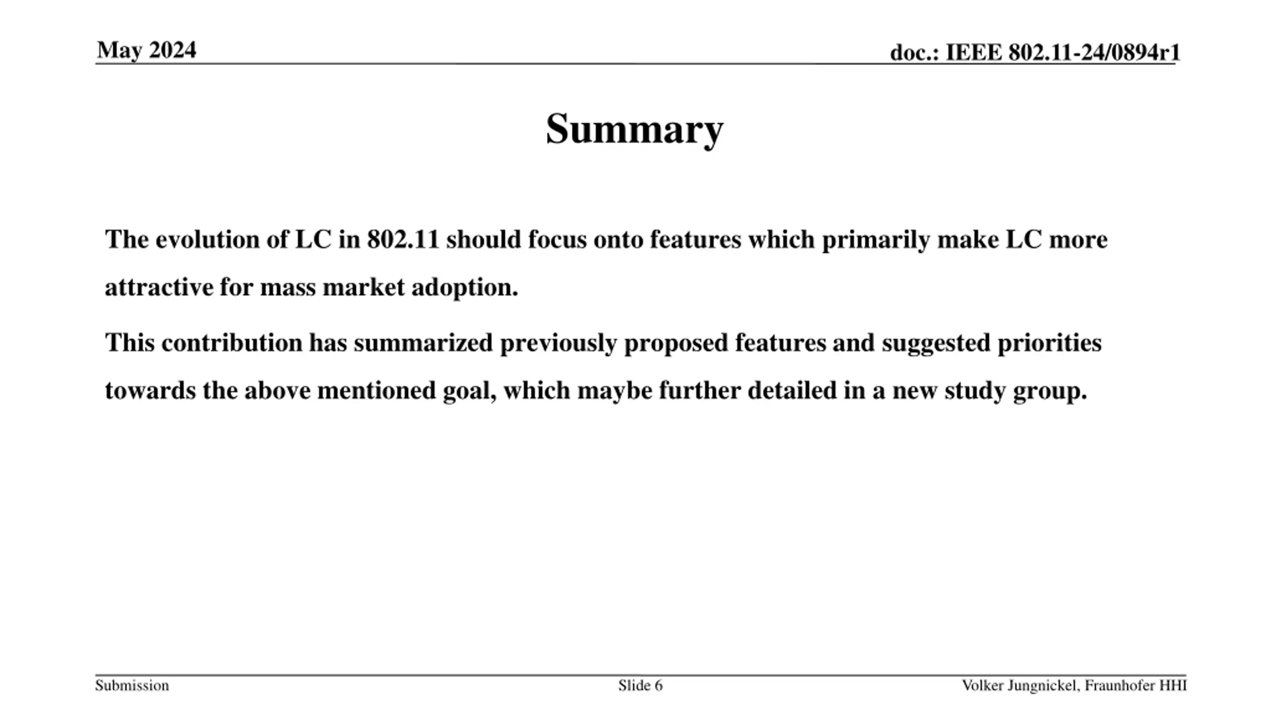 May 2024 doc.: IEEE 802.11-24/0894r1 Summary The evolution of LC in 802.11 should focus onto features which primarily make LC more attractive for mass market adoption. This contribution has summarized previously proposed features and suggested priorities towards the above mentioned goal, which maybe further detailed in a new study group. Submission Slide 6 Volker Jungnickel, Fraunhofer HHI