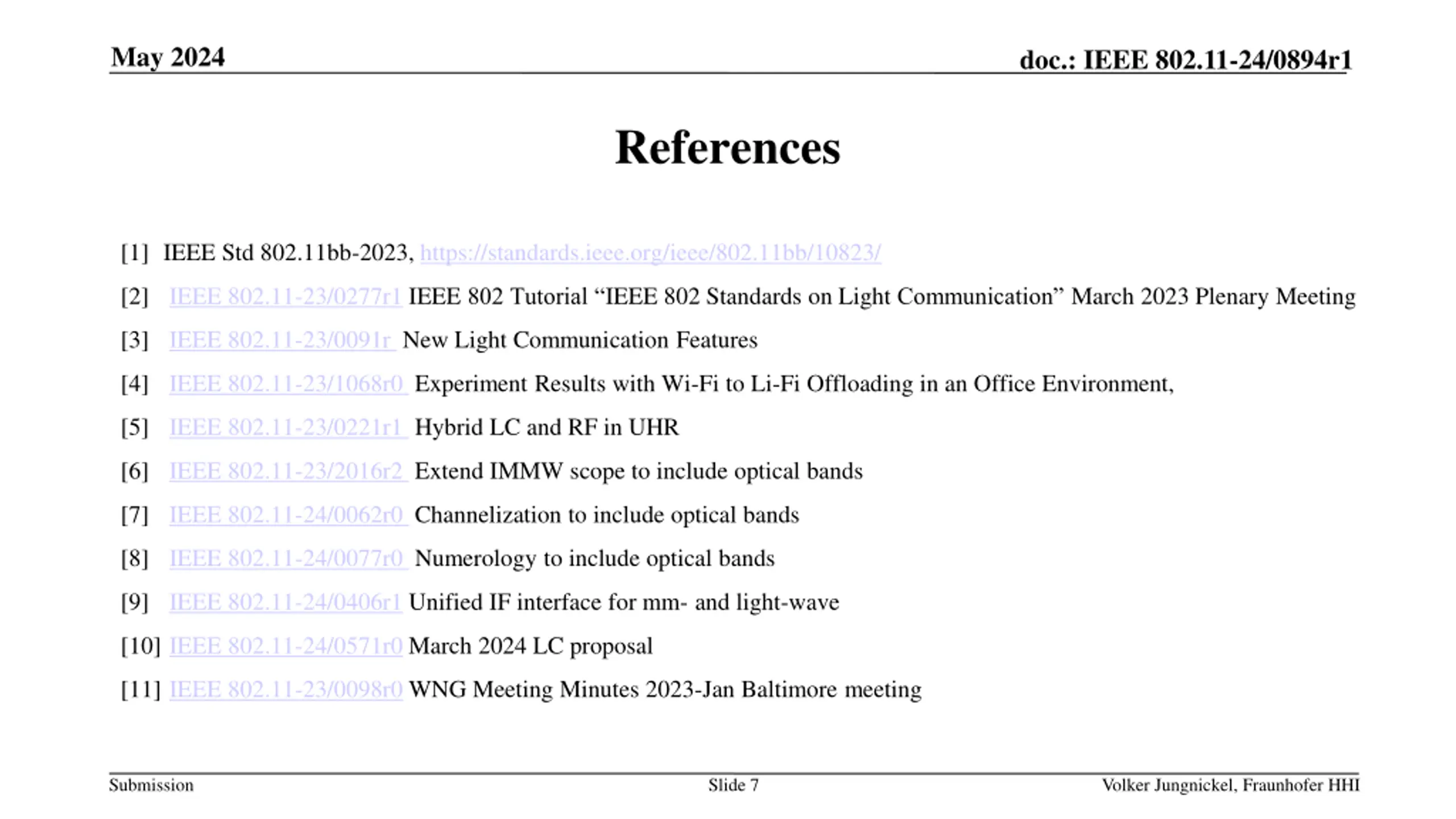 May 2024 doc.: IEEE 802.11-24/0894r1 References [1] IEEE Std 802.11bb-2023, https://standards.ieee.org/ieee/802.11bb/10823/ [2] IEEE 802.11-23/0277r1 IEEE 802 Tutorial IEEE 802 Standards on Light Communication March 2023 Plenary Meeting [3] IEEE 802.11-23/0091r New Light Communication Features [4] IEEE 802.11-23/1068r0 Experiment Results with Wi-Fi to Li-Fi Offloading in an Office Environment, [5] IEEE 802.11-23/0221r1 Hybrid LC and RF in UHR [6] IEEE 802.11-23/2016r2 Extend IMMW scope to include optical bands [7] IEEE 802.11-24/0062r0 Channelization to include optical bands [8] IEEE 802.11-24/0077r0 Numerology to include optical bands [9] IEEE 802.11-24/0406r1 Unified IF interface for mm- and light-wave [10] IEEE 802.11-24/0571r0 March 2024 LC proposal [11] IEEE 802.11-23/0098r0 WNG Meeting Minutes 2023-Jan Baltimore meeting Submission Slide 7 Volker Jungnickel, Fraunhofer HHI