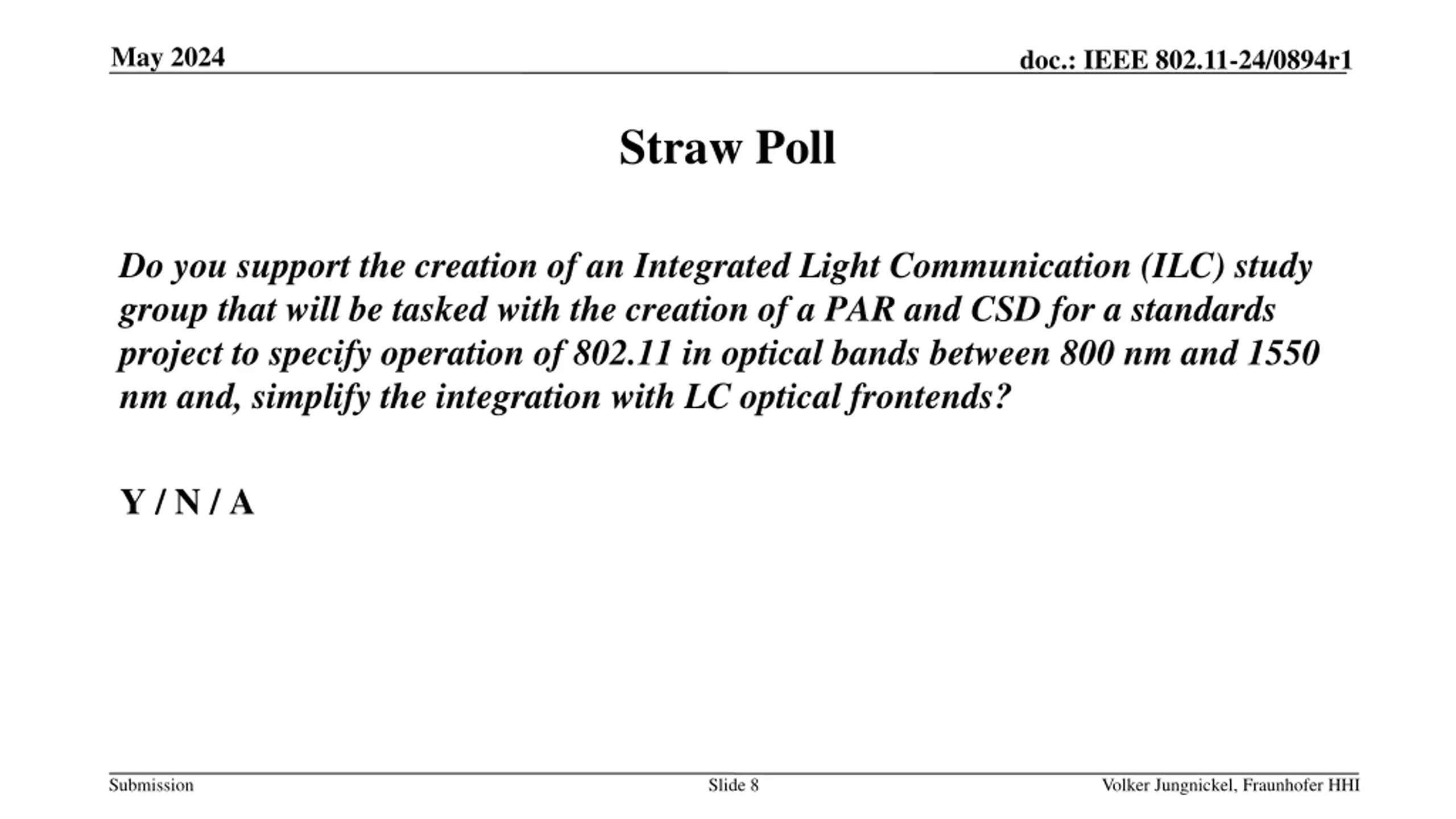May 2024 doc.: IEEE 802.11-24/0894r1 Straw Poll Do you support the creation of an Integrated Light Communication (ILC) study group that will be tasked with the creation of a PAR and CSD for a standards project to specify operation of 802.11 in optical bands between 800 nm and 1550 nm and, simplify the integration with LC optical frontends? Y / N / A Submission Slide 8 Volker Jungnickel, Fraunhofer HHI