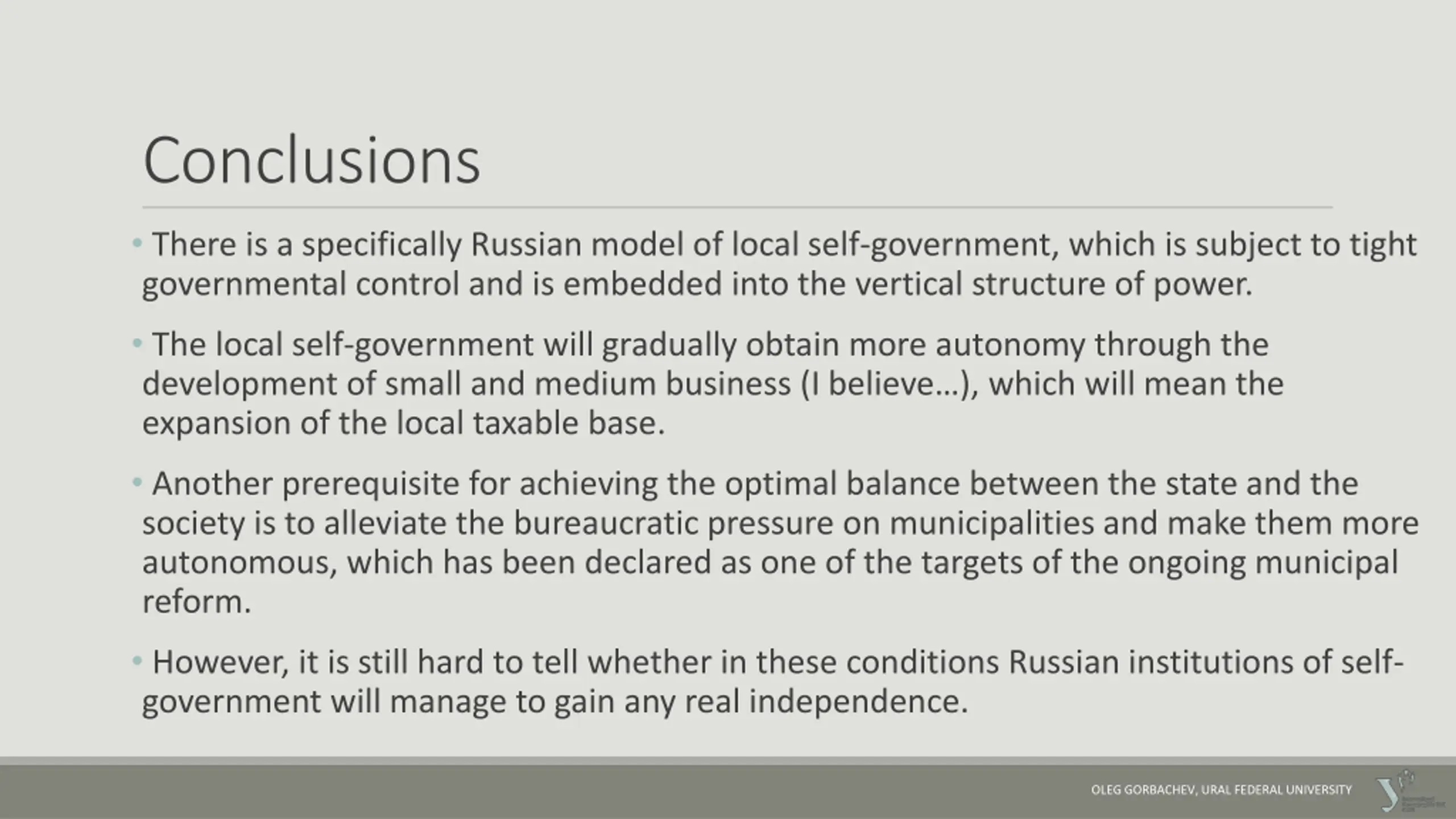 Conclusions There is a specifically Russian model of local self-government, which is subject to tight governmental control and is embedded into the vertical structure of power. The local self-government will gradually obtain more autonomy through the development of small and medium business (I believe ), which will mean the expansion of the local taxable base. Another prerequisite for achieving the optimal balance between the state and the society is to alleviate the bureaucratic pressure on municipalities and make them more autonomous, which has been declared as one of the targets of the ongoing municipal reform. However, it is still hard to tell whether in these conditions Russian institutions of self- government will manage to gain any real independence. OLEG GORBACHEV, URAL FEDERAL UNIVERSITY