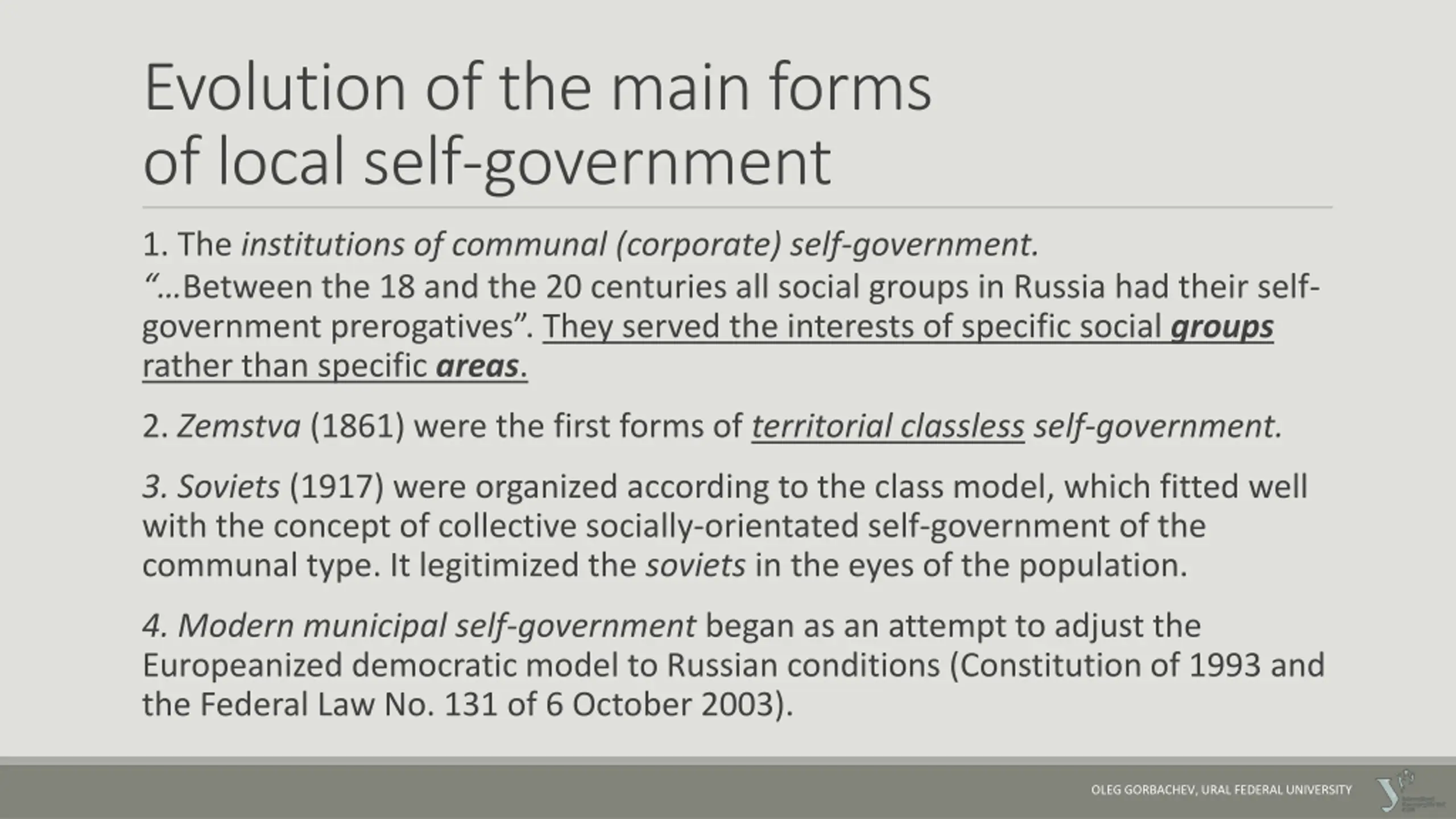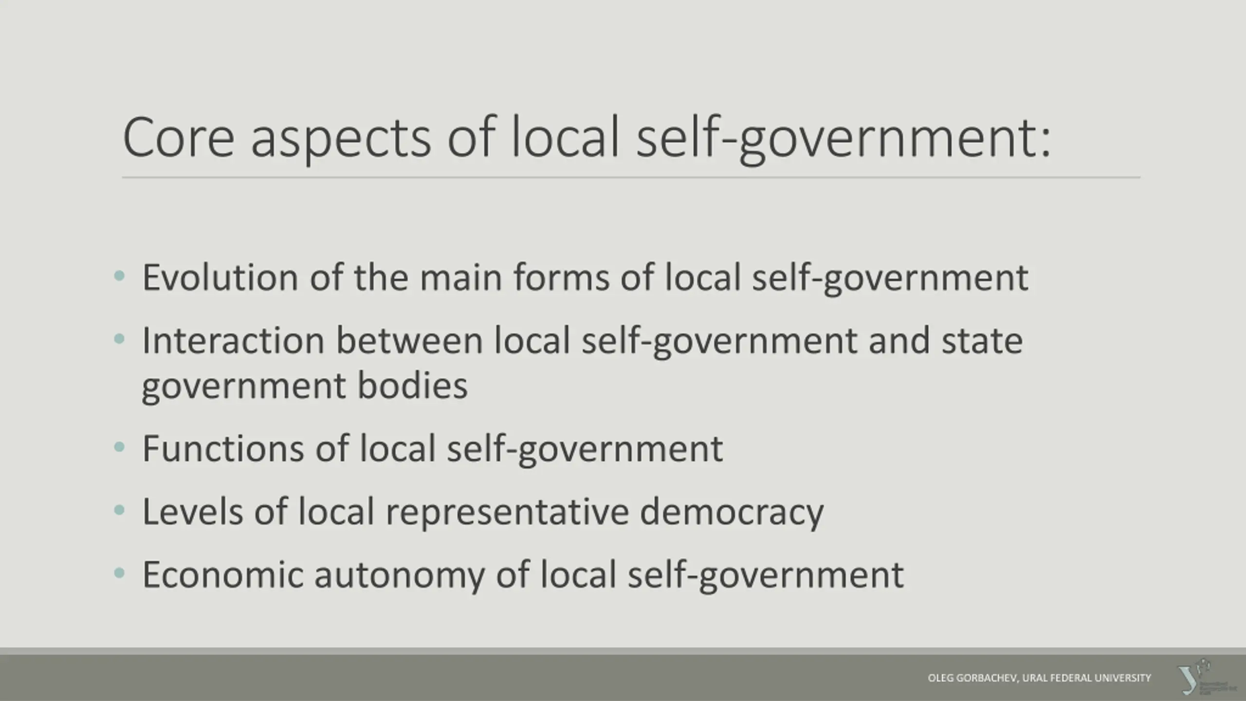 Core aspects of local self-government: Evolution of the main forms of local self-government Interaction between local self-government and state government bodies Functions of local self-government Levels of local representative democracy Economic autonomy of local self-government OLEG GORBACHEV, URAL FEDERAL UNIVERSITY