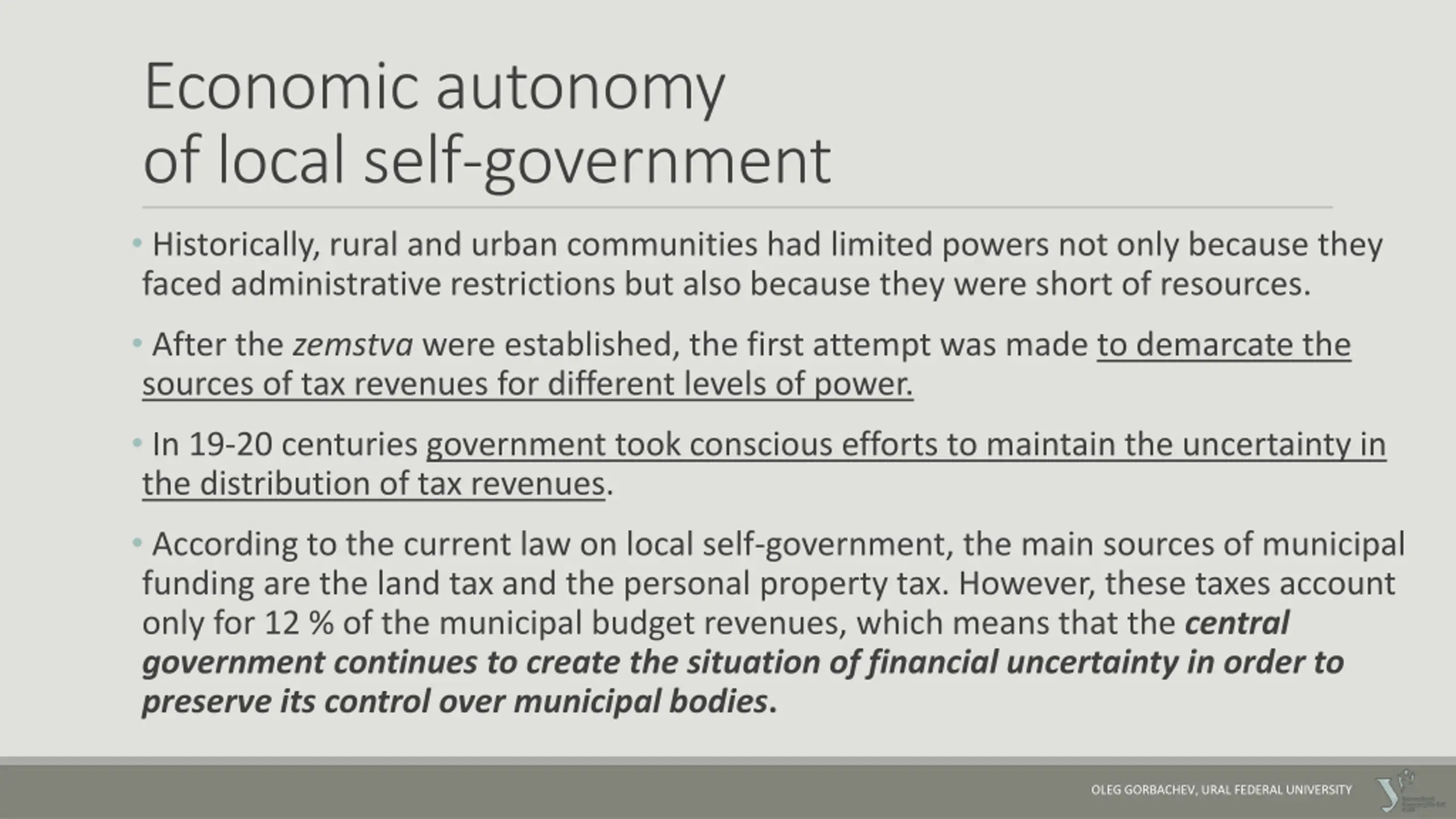 Economic autonomy of local self-government Historically, rural and urban communities had limited powers not only because they faced administrative restrictions but also because they were short of resources. After the zemstva were established, the first attempt was made to demarcate the sources of tax revenues for different levels of power. In 19-20 centuries government took conscious efforts to maintain the uncertainty in the distribution of tax revenues. According to the current law on local self-government, the main sources of municipal funding are the land tax and the personal property tax. However, these taxes account only for 12 % of the municipal budget revenues, which means that the central government continues to create the situation of financial uncertainty in order to preserve its control over municipal bodies. OLEG GORBACHEV, URAL FEDERAL UNIVERSITY