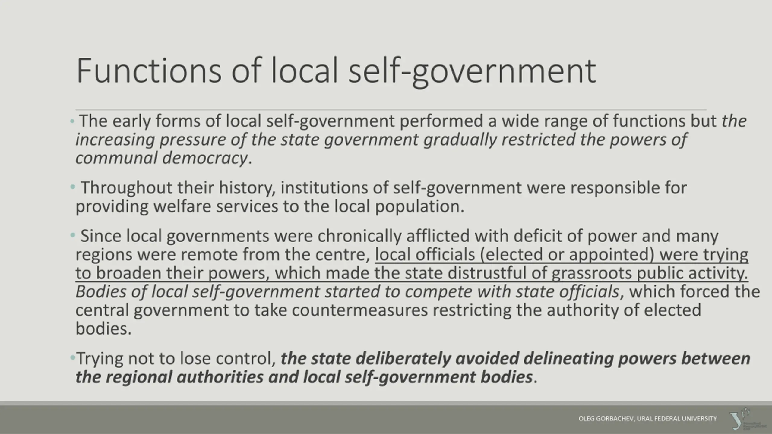 Functions of local self-government The early forms of local self-government performed a wide range of functions but the increasing pressure of the state government gradually restricted the powers of communal democracy. Throughout their history, institutions of self-government were responsible for providing welfare services to the local population. Since local governments were chronically afflicted with deficit of power and many regions were remote from the centre, local officials (elected or appointed) were trying to broaden their powers, which made the state distrustful of grassroots public activity. Bodies of local self-government started to compete with state officials, which forced the central government to take countermeasures restricting the authority of elected bodies. Trying not to lose control, the state deliberately avoided delineating powers between the regional authorities and local self-government bodies. OLEG GORBACHEV, URAL FEDERAL UNIVERSITY