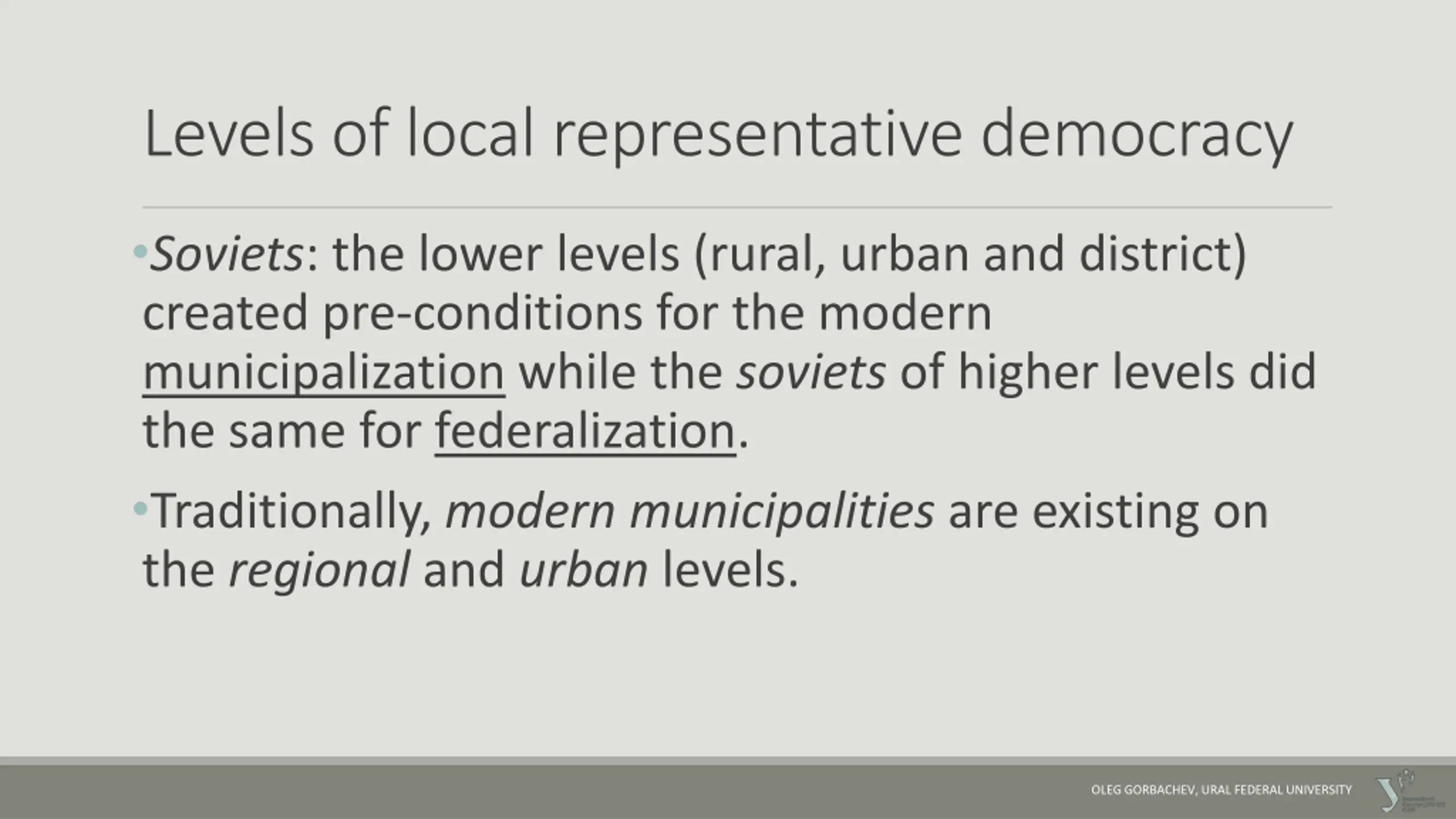 Levels of local representative democracy Soviets: the lower levels (rural, urban and district) created pre-conditions for the modern municipalization while the soviets of higher levels did the same for federalization. Traditionally, modernmunicipalities are existing on the regional and urban levels. OLEG GORBACHEV, URAL FEDERAL UNIVERSITY