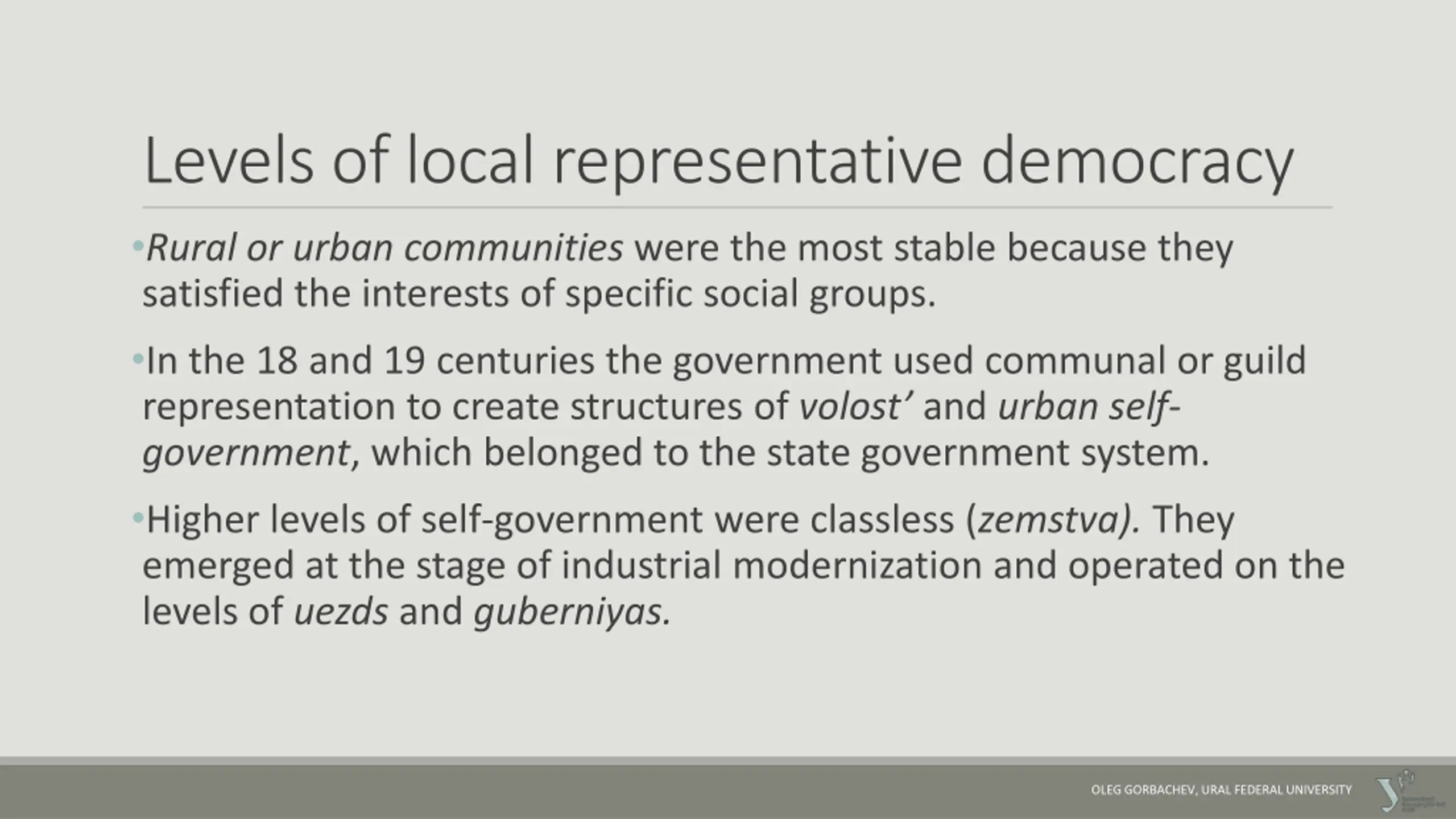 Levels of local representative democracy Rural or urban communities were the most stable because they satisfied the interests of specific social groups. In the 18 and 19 centuries the government used communal or guild representation to create structures of volost and urban self- government, which belonged to the state government system. Higher levels of self-government were classless (zemstva). They emerged at the stage of industrial modernization and operated on the levels of uezds and guberniyas. OLEG GORBACHEV, URAL FEDERAL UNIVERSITY