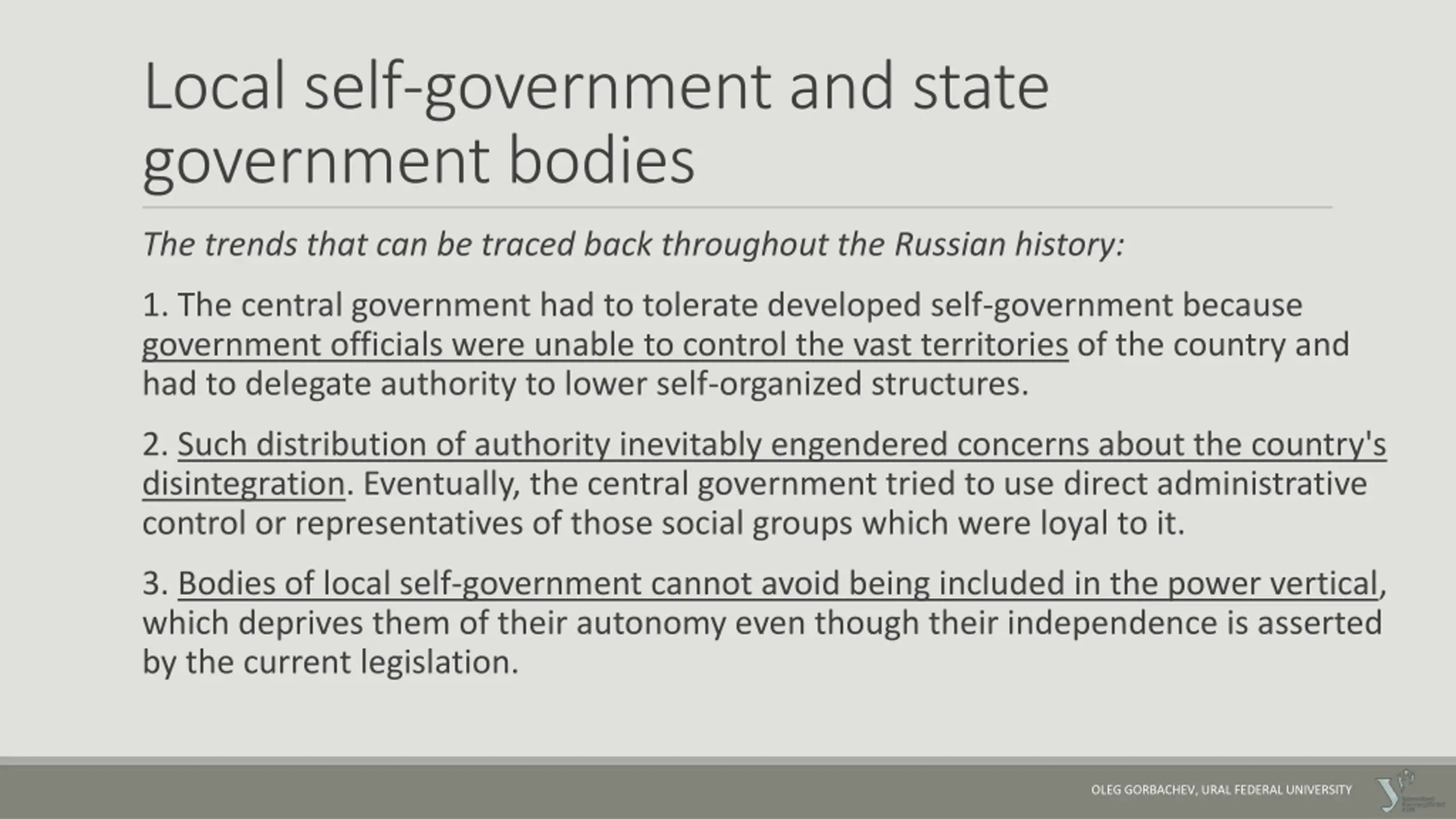 Local self-government and state government bodies The trends that can be traced back throughout the Russian history: 1. The central government had to tolerate developed self-government because government officials were unable to control the vast territories of the country and had to delegate authority to lower self-organized structures. 2. Such distribution of authority inevitably engendered concerns about the country's disintegration. Eventually, the central government tried to use direct administrative control or representatives of those social groups which were loyal to it. 3. Bodies of local self-government cannot avoid being included in the power vertical, which deprives them of their autonomy even though their independence is asserted by the current legislation. OLEG GORBACHEV, URAL FEDERAL UNIVERSITY