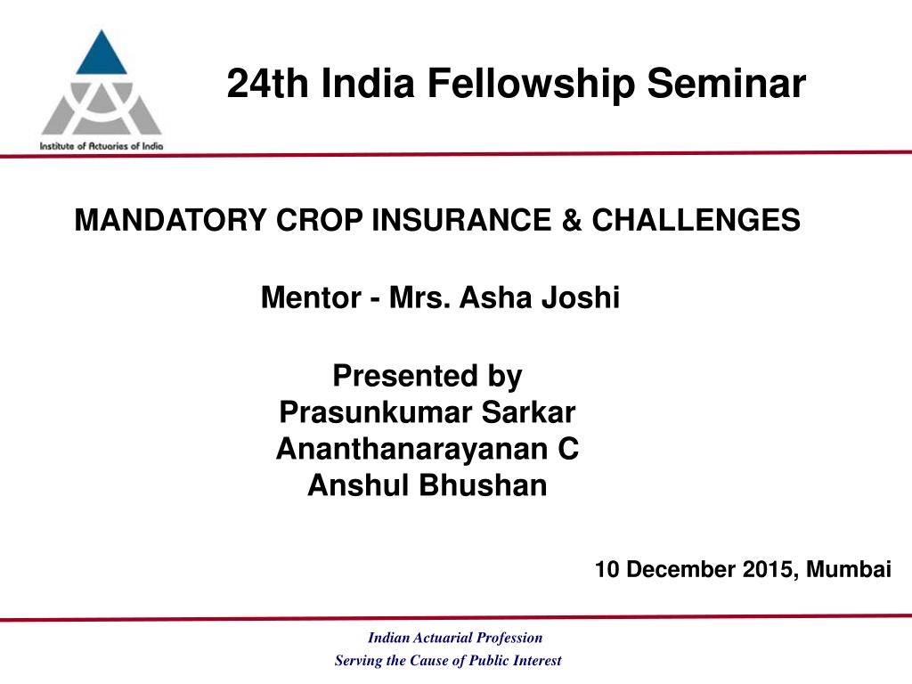 24th India Fellowship Seminar MANDATORY CROP INSURANCE & CHALLENGES Mentor - Mrs. Asha Joshi Presented by Prasunkumar Sarkar Ananthanarayanan C Anshul Bhushan 10 December 2015, Mumbai Indian Actuarial Profession Serving the Cause of Public Interest