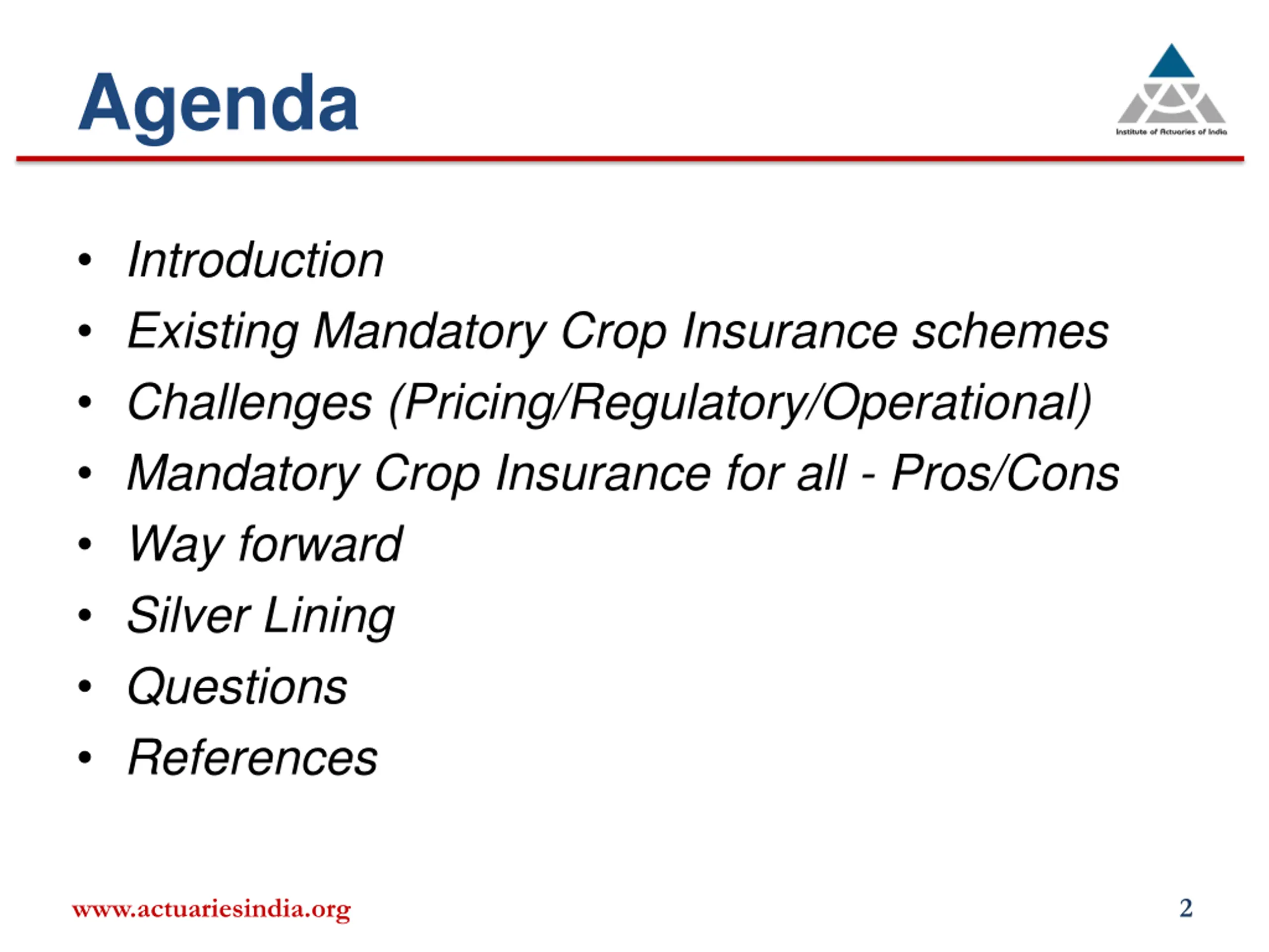 Agenda Introduction Existing Mandatory Crop Insurance schemes Challenges (Pricing/Regulatory/Operational) Mandatory Crop Insurance for all - Pros/Cons Way forward Silver Lining Questions References www.actuariesindia.org 2