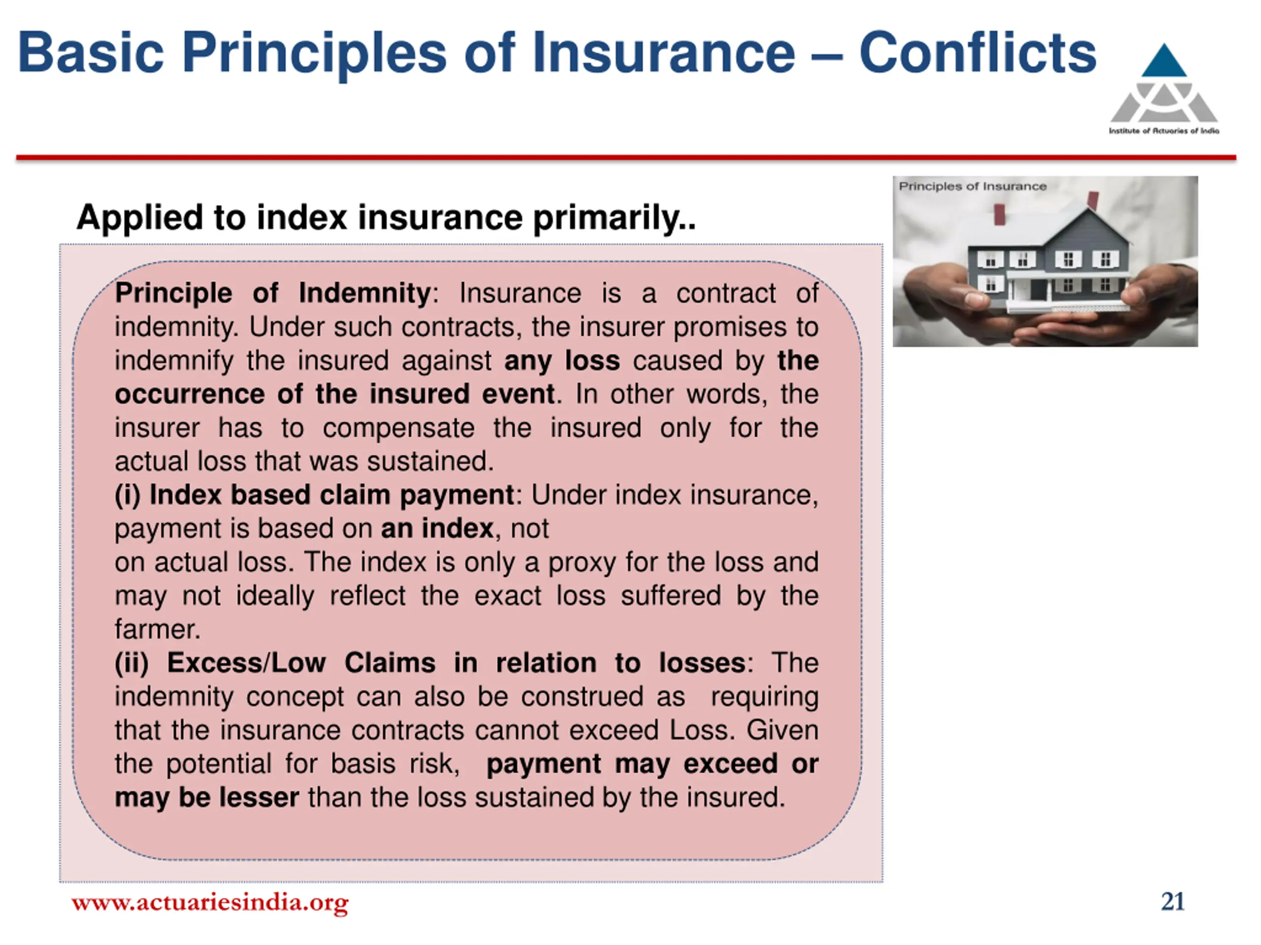 Basic Principles of Insurance Conflicts http://lh4.googleusercontent.com/_iFIztPmvqg8/TYnFF58jPoI/AAAAAAAAEVg/3adUlDUK0y4/Principles-of-Insurance.jpg Applied to index insurance primarily.. Principle of Indemnity: Insurance is a contract of indemnity. Under such contracts, the insurer promises to indemnify the insured against any loss caused by the occurrence of the insured event. In other words, the insurer has to compensate the insured only for the actual loss that was sustained. (i) Index based claim payment: Under index insurance, payment is based on an index, not on actual loss. The index is only a proxy for the loss and may not ideally reflect the exact loss suffered by the farmer. (ii) Excess/Low Claims in relation to losses: The indemnity concept can also be construed as requiring that the insurance contracts cannot exceed Loss. Given the potential for basis risk, payment may exceed or may be lesser than the loss sustained by the insured. www.actuariesindia.org 21