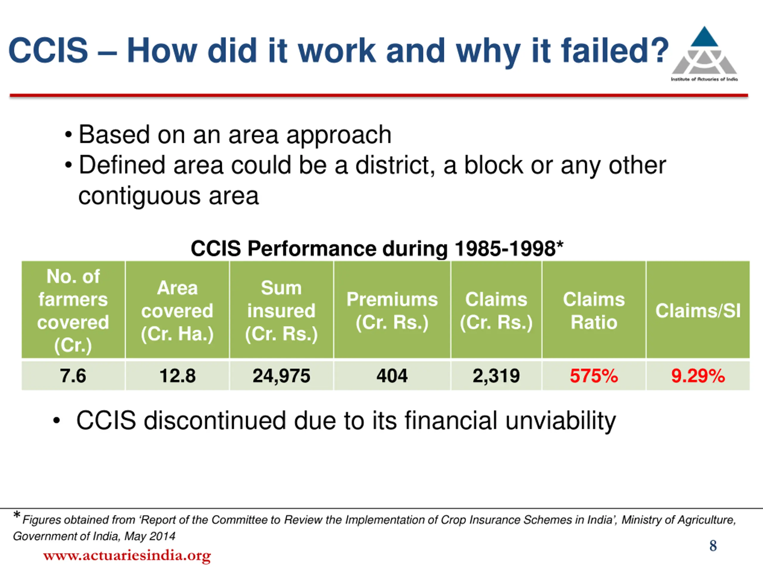 CCIS - Introduction Comprehensive Crop Insurance Scheme introduced in 1985 Operated for almost a decade and a half Scheme covered cereals, pulses and oilseeds States were free to choose whether to implement it or not CCIS compulsory for farmers taking loans for crops production Farmer insured for 100% of the loan Premiums and claim amounts shared by Central and State govt. in the ratio of 2:1 Uniform premium rate for the whole country based on crop 50% subsidy for small and marginal farmers www.actuariesindia.org 7