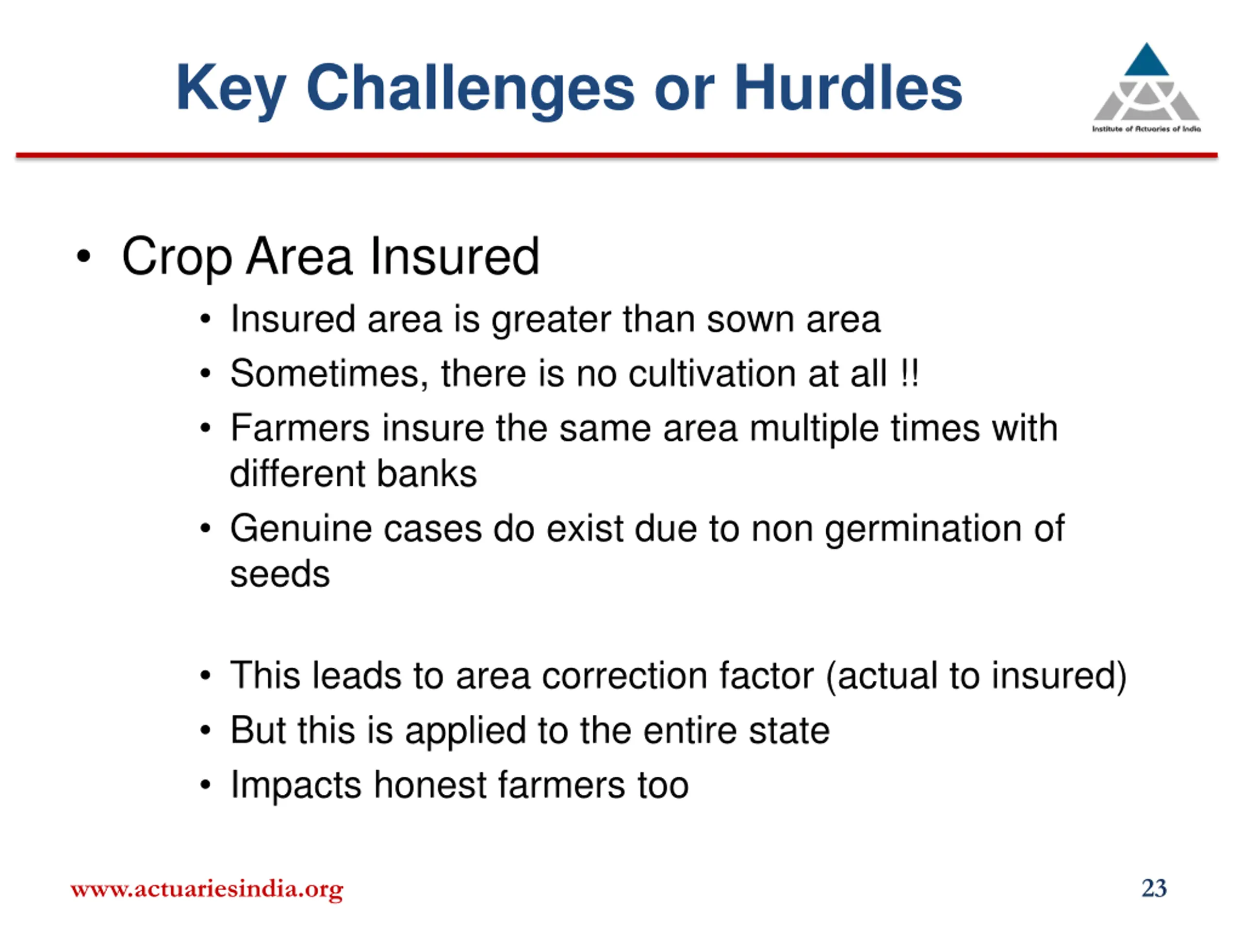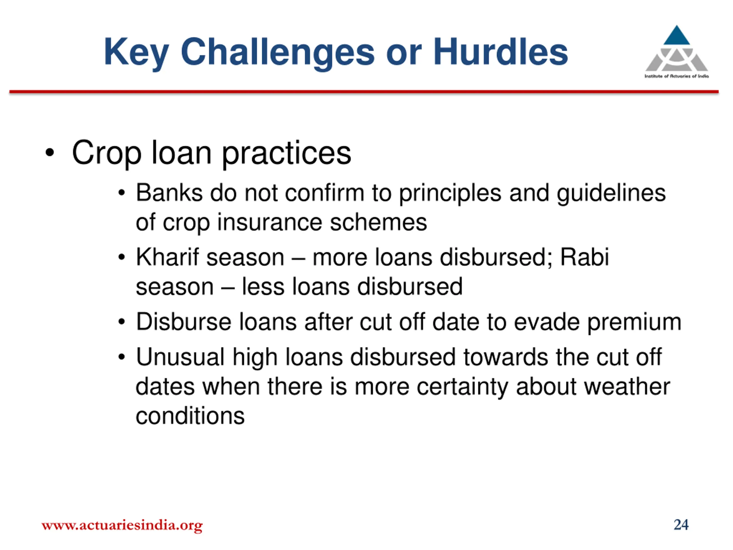 Key Challenges or Hurdles Crop Area Insured Insured area is greater than sown area Sometimes, there is no cultivation at all !! Farmers insure the same area multiple times with different banks Genuine cases do exist due to non germination of seeds This leads to area correction factor (actual to insured) But this is applied to the entire state Impacts honest farmers too www.actuariesindia.org 23