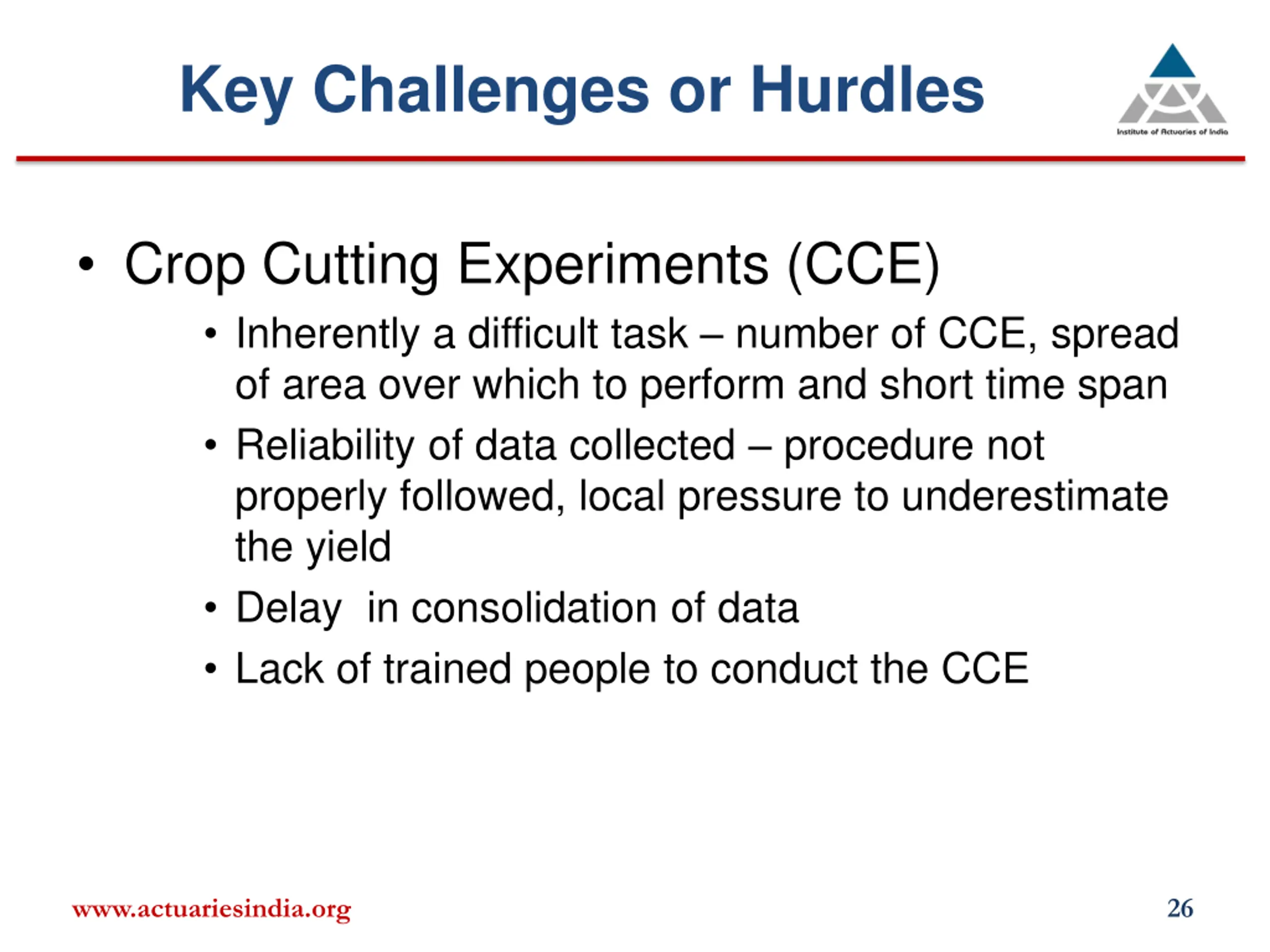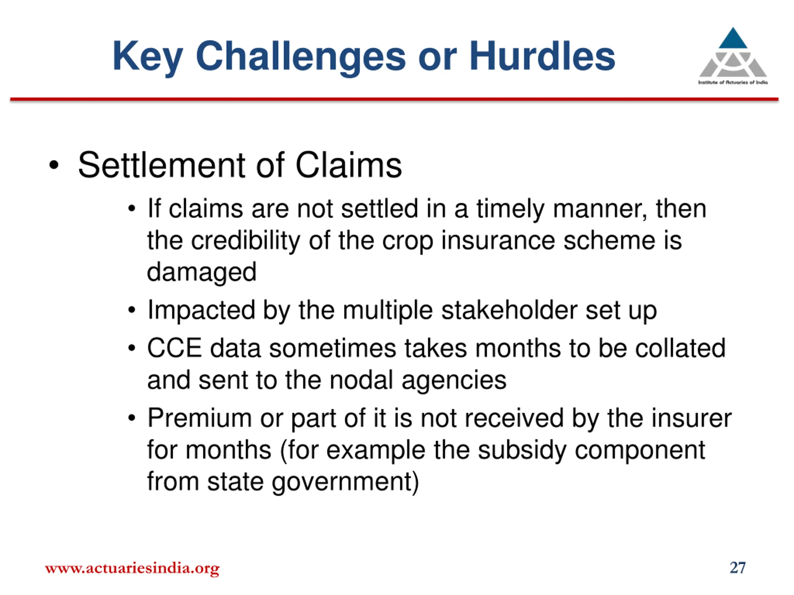 Key Challenges or Hurdles Crop Cutting Experiments (CCE) Inherently a difficult task number of CCE, spread of area over which to perform and short time span Reliability of data collected procedure not properly followed, local pressure to underestimate the yield Delay in consolidation of data Lack of trained people to conduct the CCE www.actuariesindia.org 26