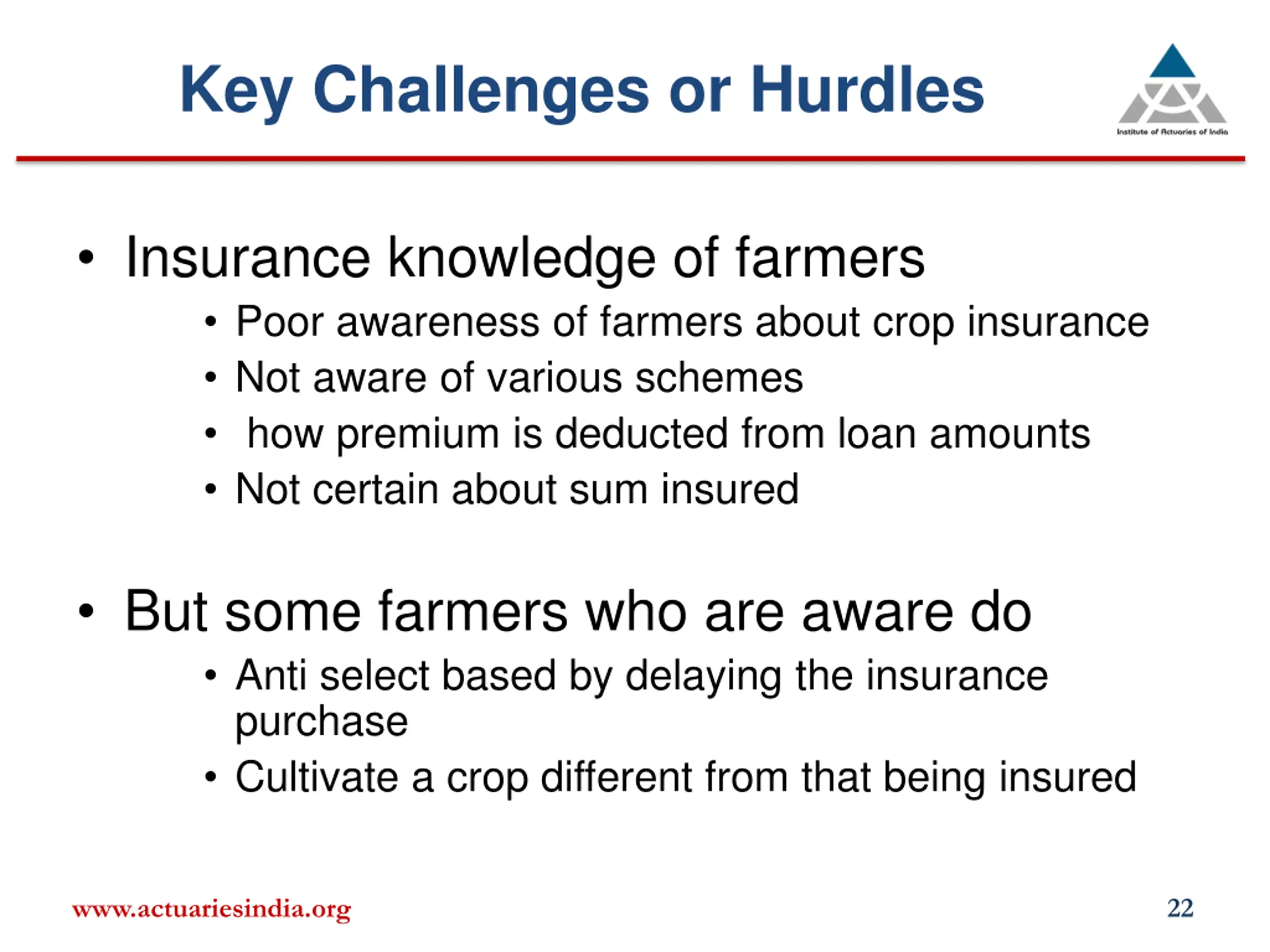 Key Challenges or Hurdles Insurance knowledge of farmers Poor awareness of farmers about crop insurance Not aware of various schemes how premium is deducted from loan amounts Not certain about sum insured But some farmers who are aware do Anti select based by delaying the insurance purchase Cultivate a crop different from that being insured www.actuariesindia.org 22
