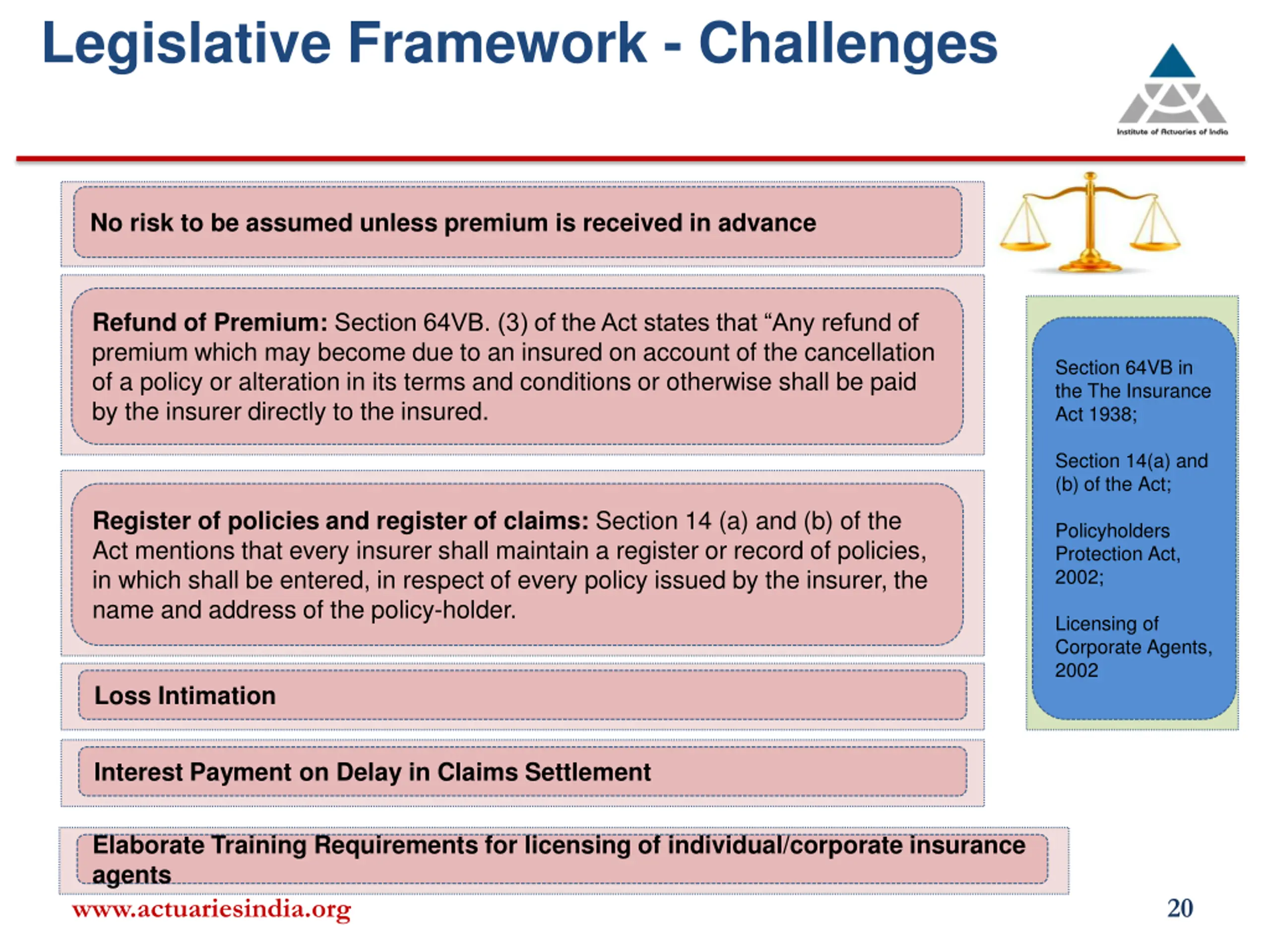 Legislative Framework - Challenges http://www.wpro.who.int/sysmedia/images/topics/legislation.jpg No risk to be assumed unless premium is received in advance Refund of Premium: Section 64VB. (3) of the Act states that Any refund of premium which may become due to an insured on account of the cancellation of a policy or alteration in its terms and conditions or otherwise shall be paid by the insurer directly to the insured. Section 64VB in the The Insurance Act 1938; Section 14(a) and (b) of the Act; Register of policies and register of claims: Section 14 (a) and (b) of the Act mentions that every insurer shall maintain a register or record of policies, in which shall be entered, in respect of every policy issued by the insurer, the name and address of the policy-holder. Policyholders Protection Act, 2002; Licensing of Corporate Agents, 2002 Loss Intimation Interest Payment on Delay in Claims Settlement Elaborate Training Requirements for licensing of individual/corporate insurance agents www.actuariesindia.org 20