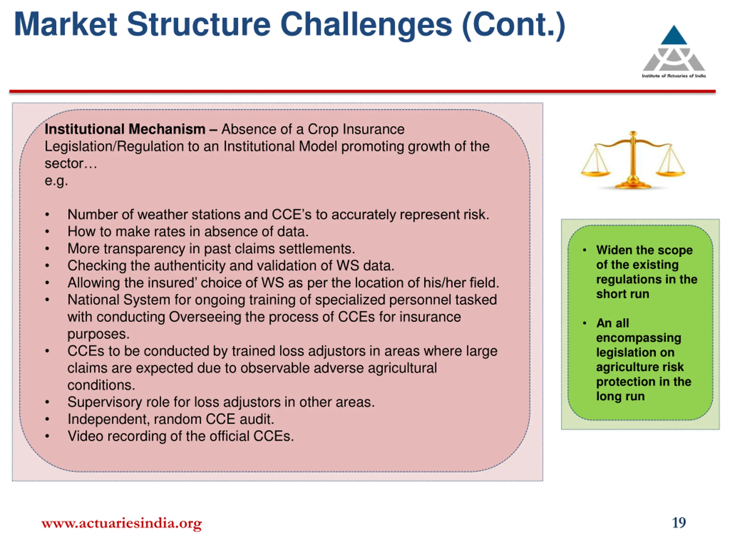 Market Structure Challenges (Cont.) Institutional Mechanism Absence of a Crop Insurance Legislation/Regulation to an Institutional Model promoting growth of the sector e.g. http://www.wpro.who.int/sysmedia/images/topics/legislation.jpg Number of weather stations and CCE s to accurately represent risk. How to make rates in absence of data. More transparency in past claims settlements. Checking the authenticity and validation of WS data. Allowing the insured choice of WS as per the location of his/her field. National System for ongoing training of specialized personnel tasked with conducting Overseeing the process of CCEs for insurance purposes. CCEs to be conducted by trained loss adjustors in areas where large claims are expected due to observable adverse agricultural conditions. Supervisory role for loss adjustors in other areas. Independent, random CCE audit. Video recording of the official CCEs. Widen the scope of the existing regulations in the short run An all encompassing legislation on agriculture risk protection in the long run www.actuariesindia.org 19