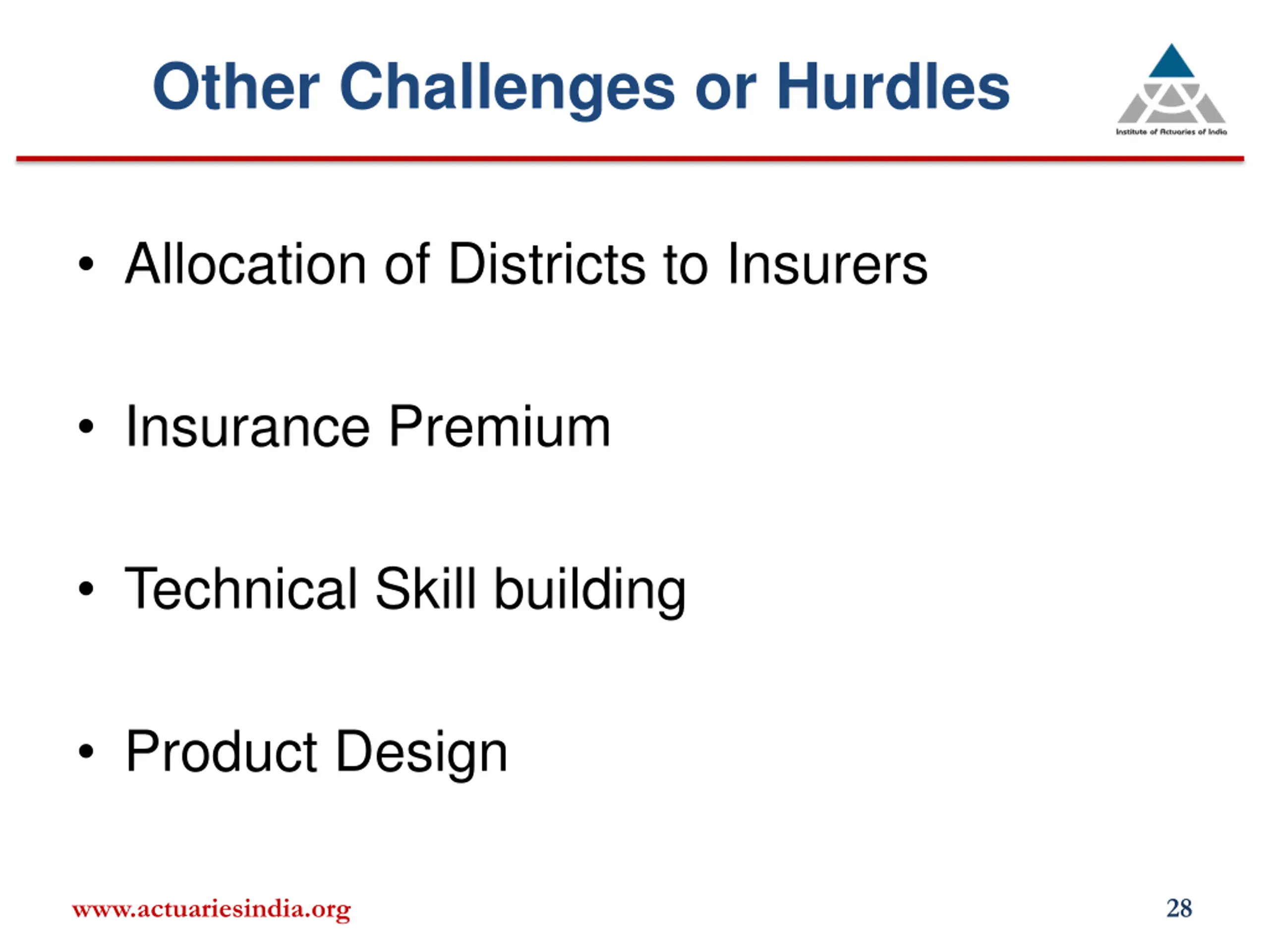 Other Challenges or Hurdles Allocation of Districts to Insurers Insurance Premium Technical Skill building Product Design www.actuariesindia.org 28