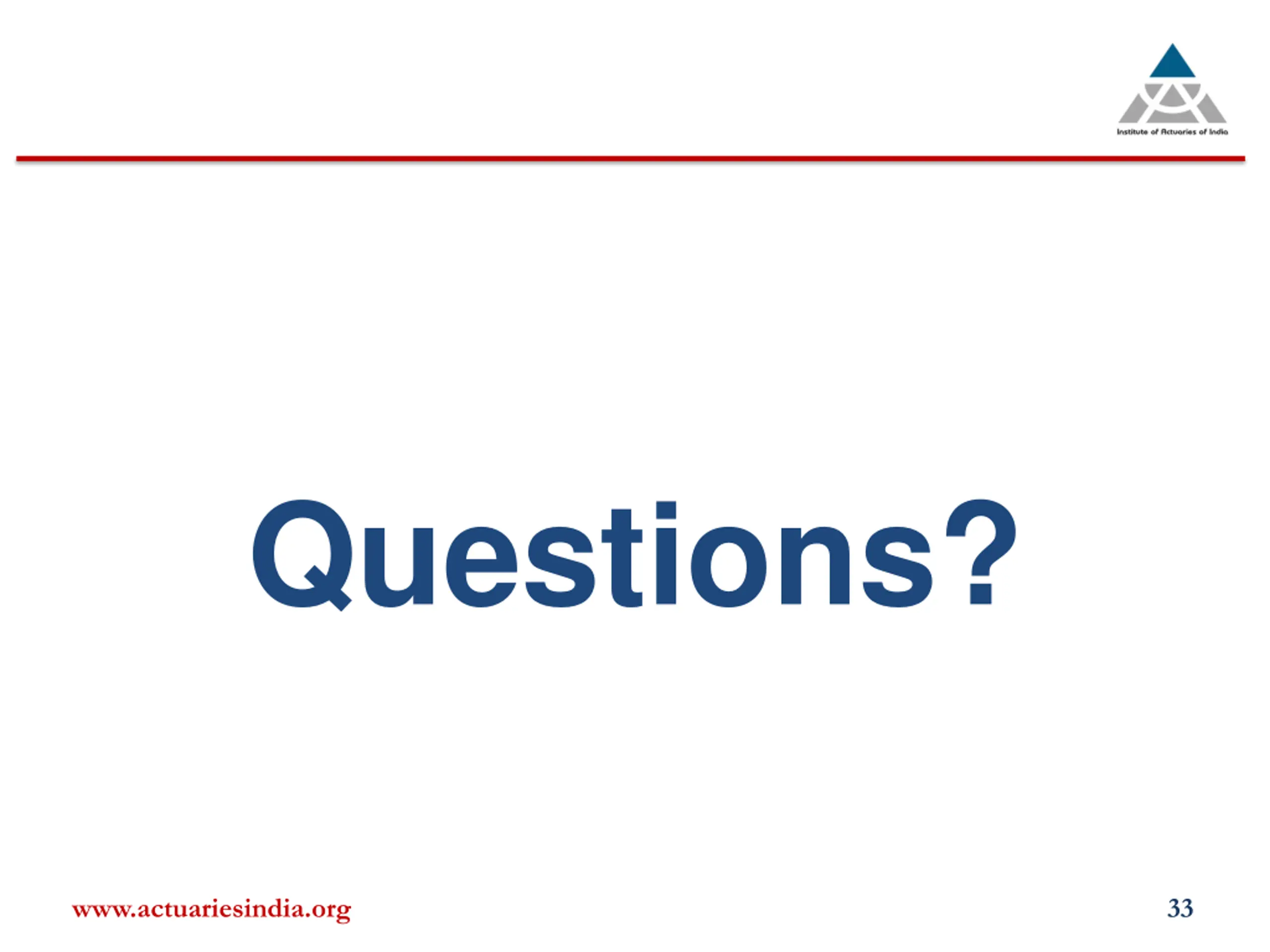 Silver Lining Though we have addressed issues in crop insurance, it does not imply all is wrong with it Some positives from crop insurance It has indemnified farmers in times of adversity Awareness of crop insurance is gradually increasing It has given insurance companies scope to diversify their product portfolio More focus on crop and its associated risks has also brought multi stakeholders together & sharing knowledge www.actuariesindia.org 32