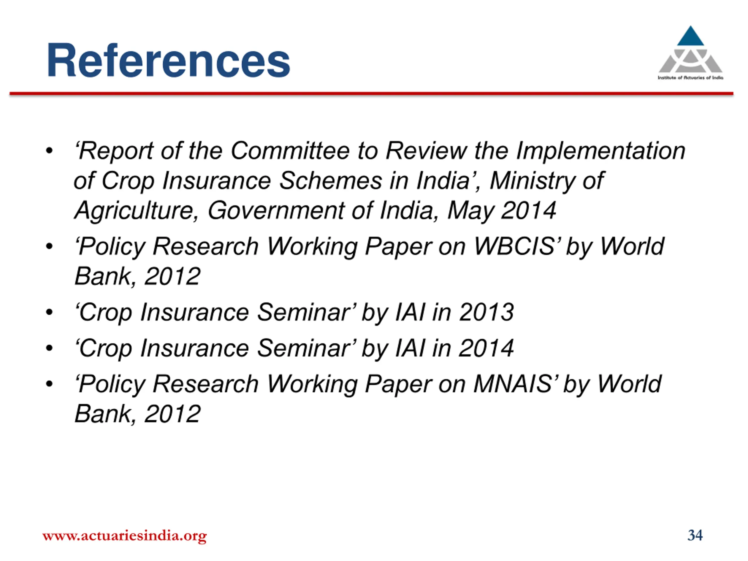 References Report of the Committee to Review the Implementation of Crop Insurance Schemes in India , Ministry of Agriculture, Government of India, May 2014 Policy Research Working Paper on WBCIS by World Bank, 2012 Crop Insurance Seminar by IAI in 2013 Crop Insurance Seminar by IAI in 2014 Policy Research Working Paper on MNAIS by World Bank, 2012 www.actuariesindia.org 34