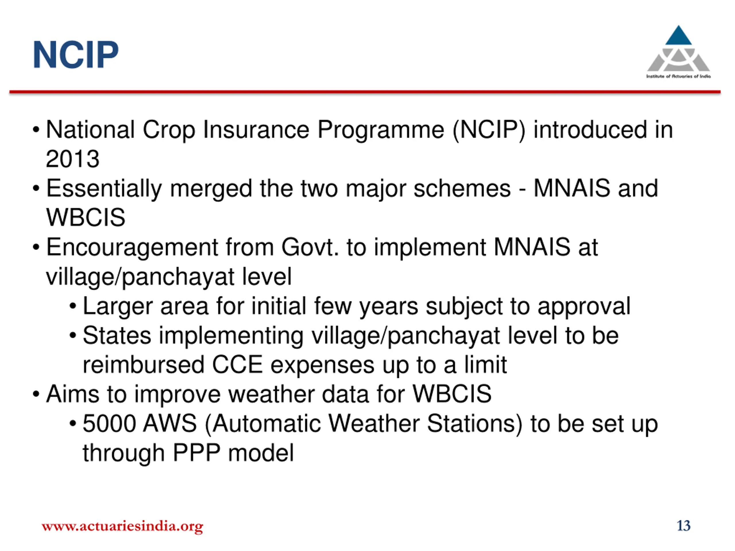History of Crop Insurance in India In existence since the past three decades Each successive scheme tried to improve on the previous schemes shortcomings Major schemes introduced by the Government of India CCIS (Comprehensive Crop Insurance Scheme) - 1985 NAIS (National Agricultural Insurance Scheme) - 1999 MNAIS (Modified NAIS) - 2010 WBCIS (Weather Based Crop Insurance Scheme) - 2007 NCIP (National Crop Insurance Programme) - 2013 www.actuariesindia.org 6