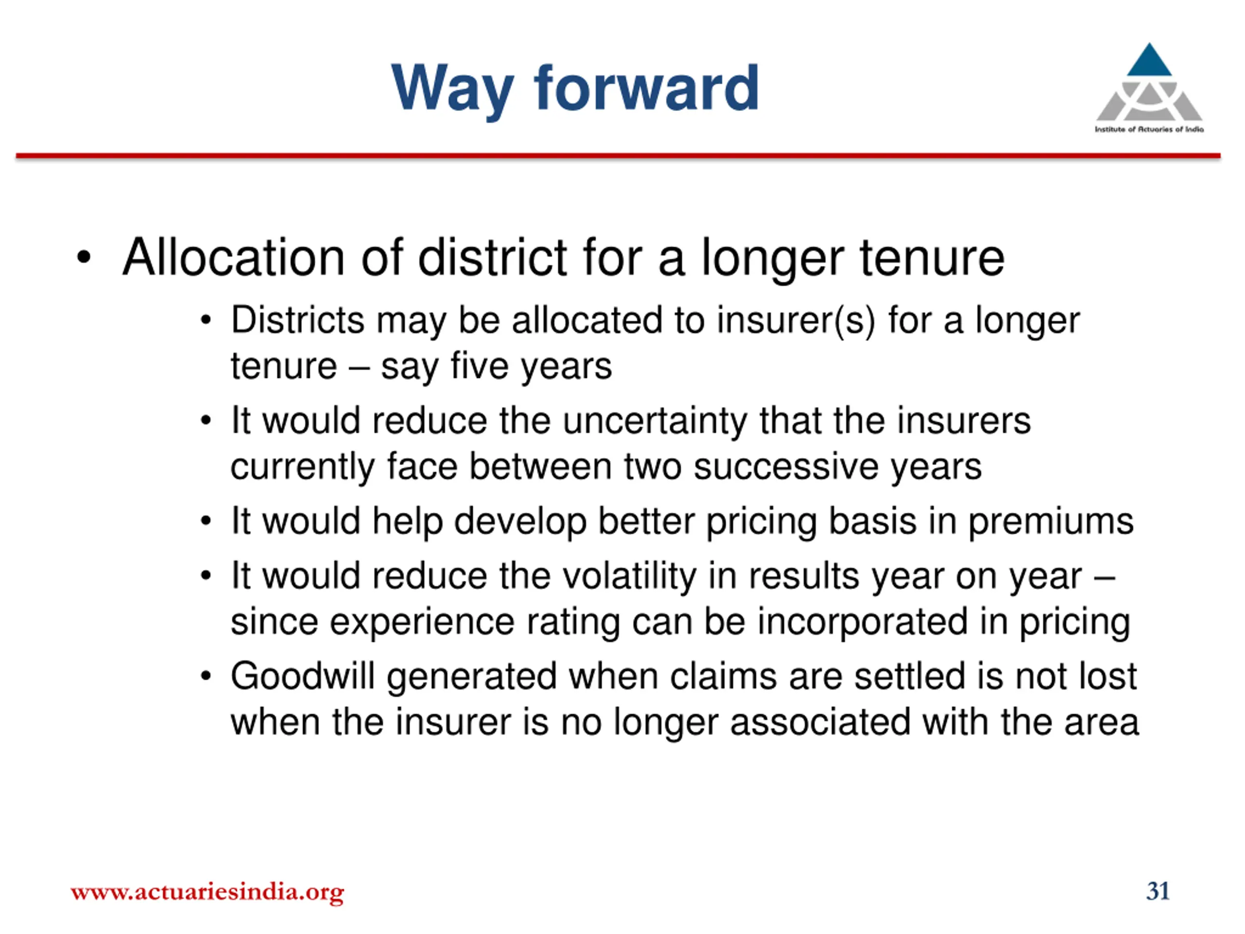 Way forward Allocation of district for a longer tenure Districts may be allocated to insurer(s) for a longer tenure say five years It would reduce the uncertainty that the insurers currently face between two successive years It would help develop better pricing basis in premiums It would reduce the volatility in results year on year since experience rating can be incorporated in pricing Goodwill generated when claims are settled is not lost when the insurer is no longer associated with the area www.actuariesindia.org 31
