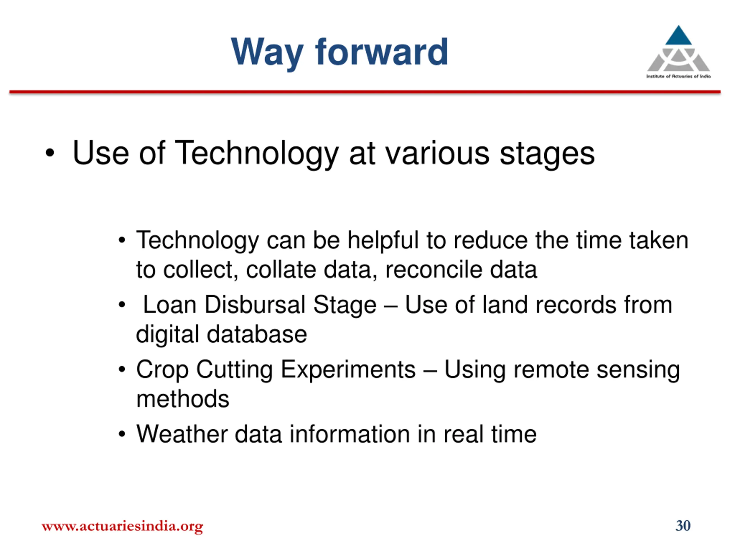 Way forward Use of Technology at various stages Technology can be helpful to reduce the time taken to collect, collate data, reconcile data Loan Disbursal Stage Use of land records from digital database Crop Cutting Experiments Using remote sensing methods Weather data information in real time www.actuariesindia.org 30