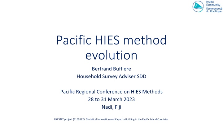 Pacific HIES method evolution Bertrand Buffiere Household Survey Adviser SDD Pacific Regional Conference on HIES Methods 28 to 31 March 2023 Nadi, Fiji PACSTAT project (P169122): Statistical Innovation and Capacity Building in the Pacific Island Countries