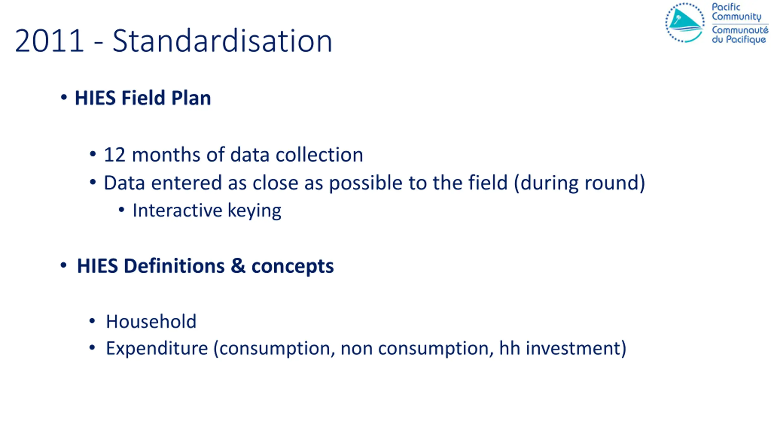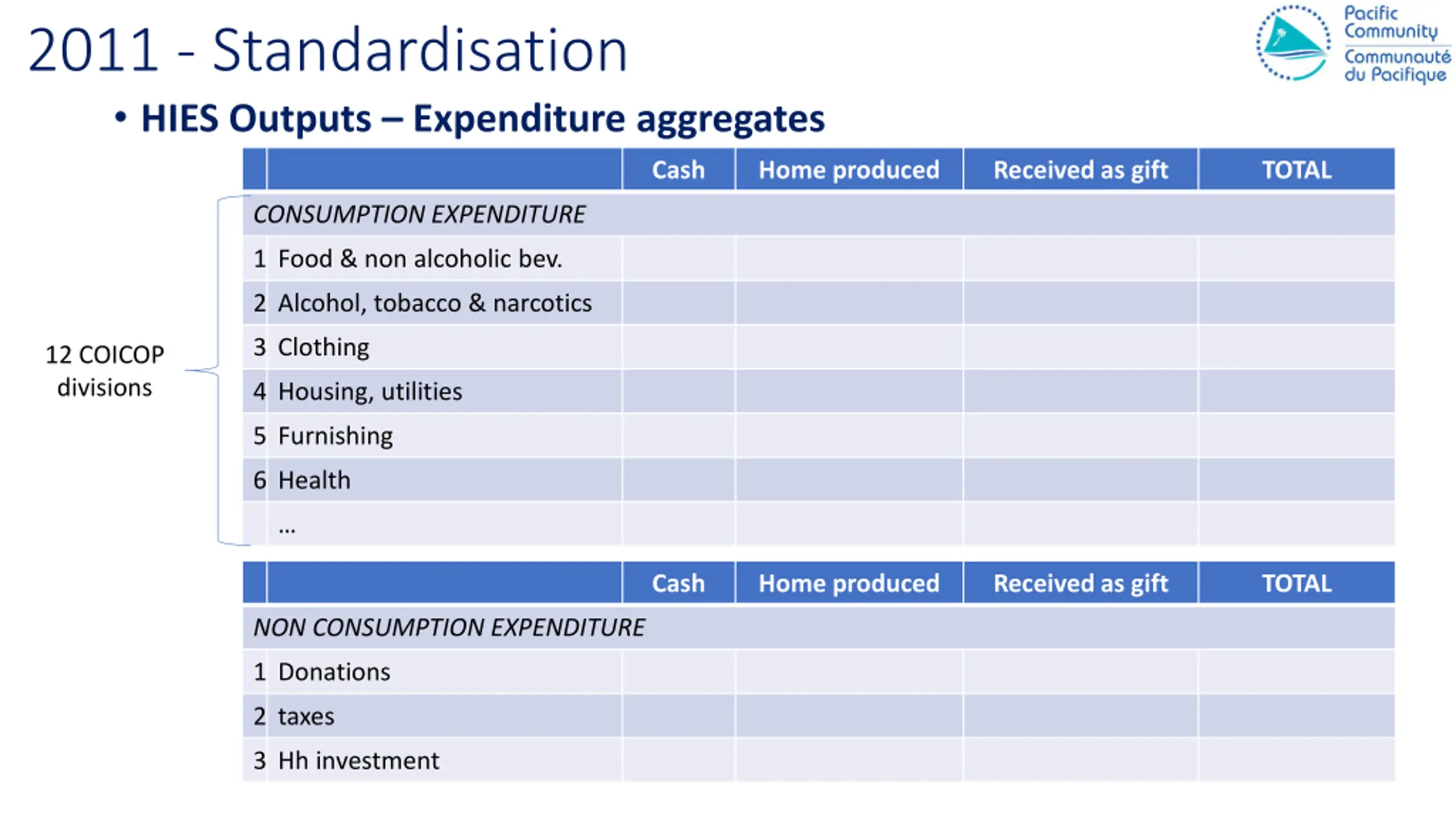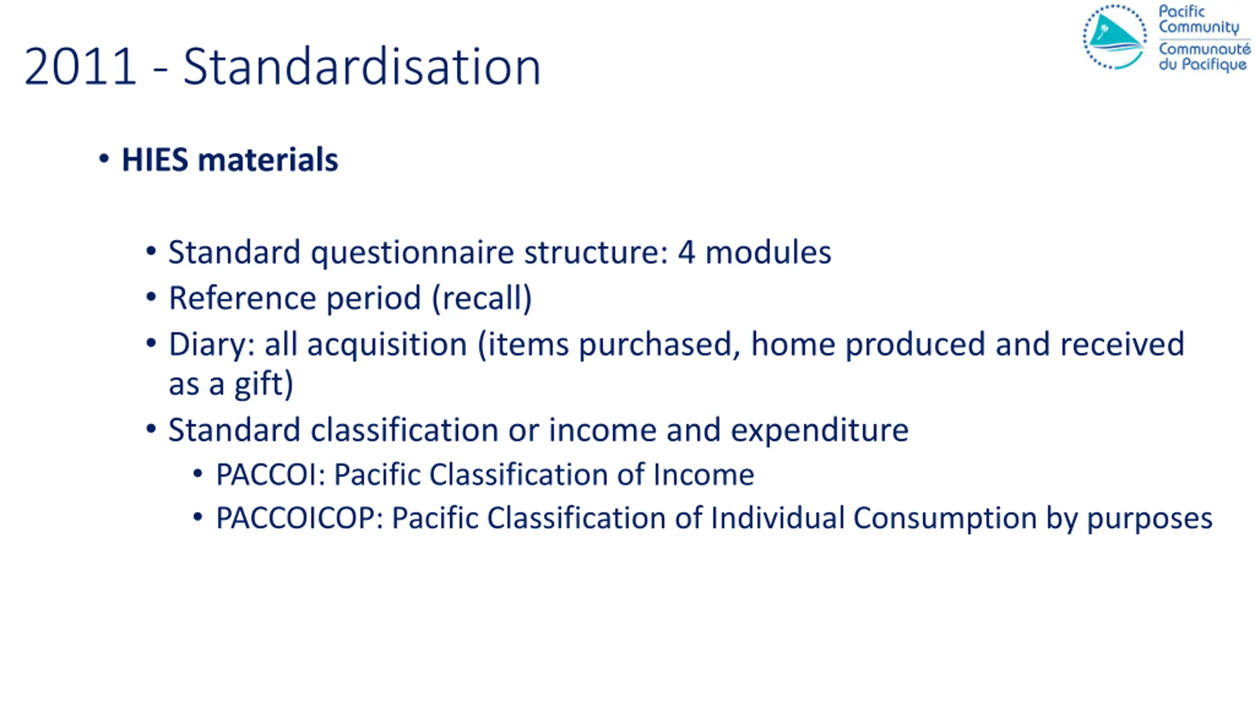 2011 - Standardisation HIES materials Standard questionnaire structure: 4 modules Reference period (recall) Diary: all acquisition (items purchased, home produced and received as a gift) Standard classification or income and expenditure PACCOI: Pacific Classification of Income PACCOICOP: Pacific Classification of Individual Consumption by purposes