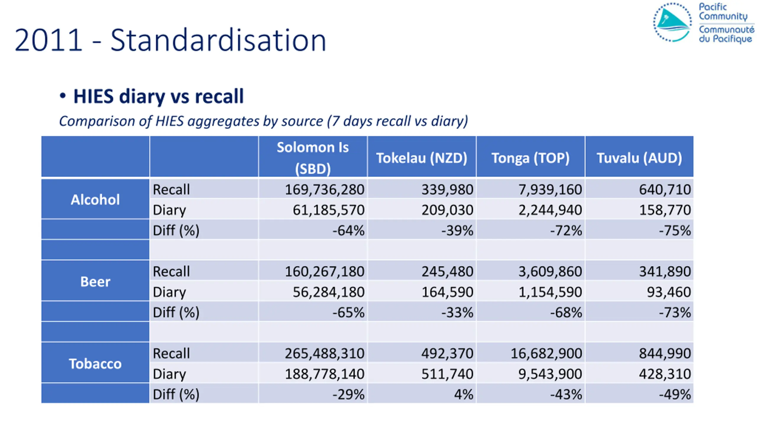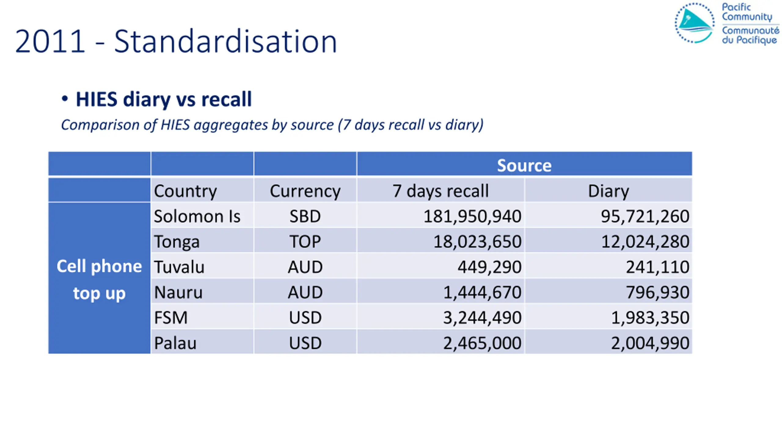 2011 - Standardisation HIES diary vs recall Due to issues in the diary (under reporting) some items were collected through 7 days recall questionnaire New sections on communication expenditure (cell phone top up) and alcohol, tobacco, kava, bettle nuts expenditure last 7 days