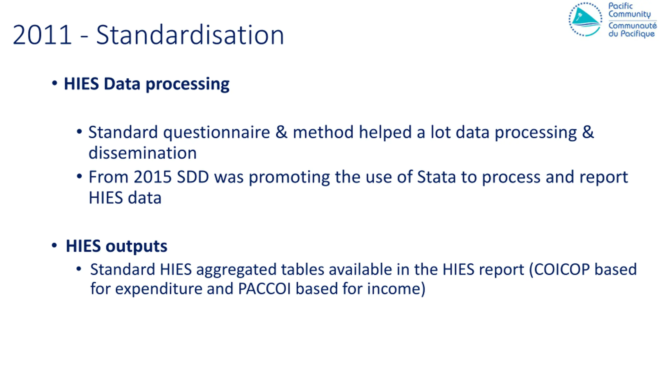 2011 - Standardisation HIES Data processing Standard questionnaire & method helped a lot data processing & dissemination From 2015 SDD was promoting the use of Stata to process and report HIES data HIES outputs Standard HIES aggregated tables available in the HIES report (COICOP based for expenditure and PACCOI based for income)
