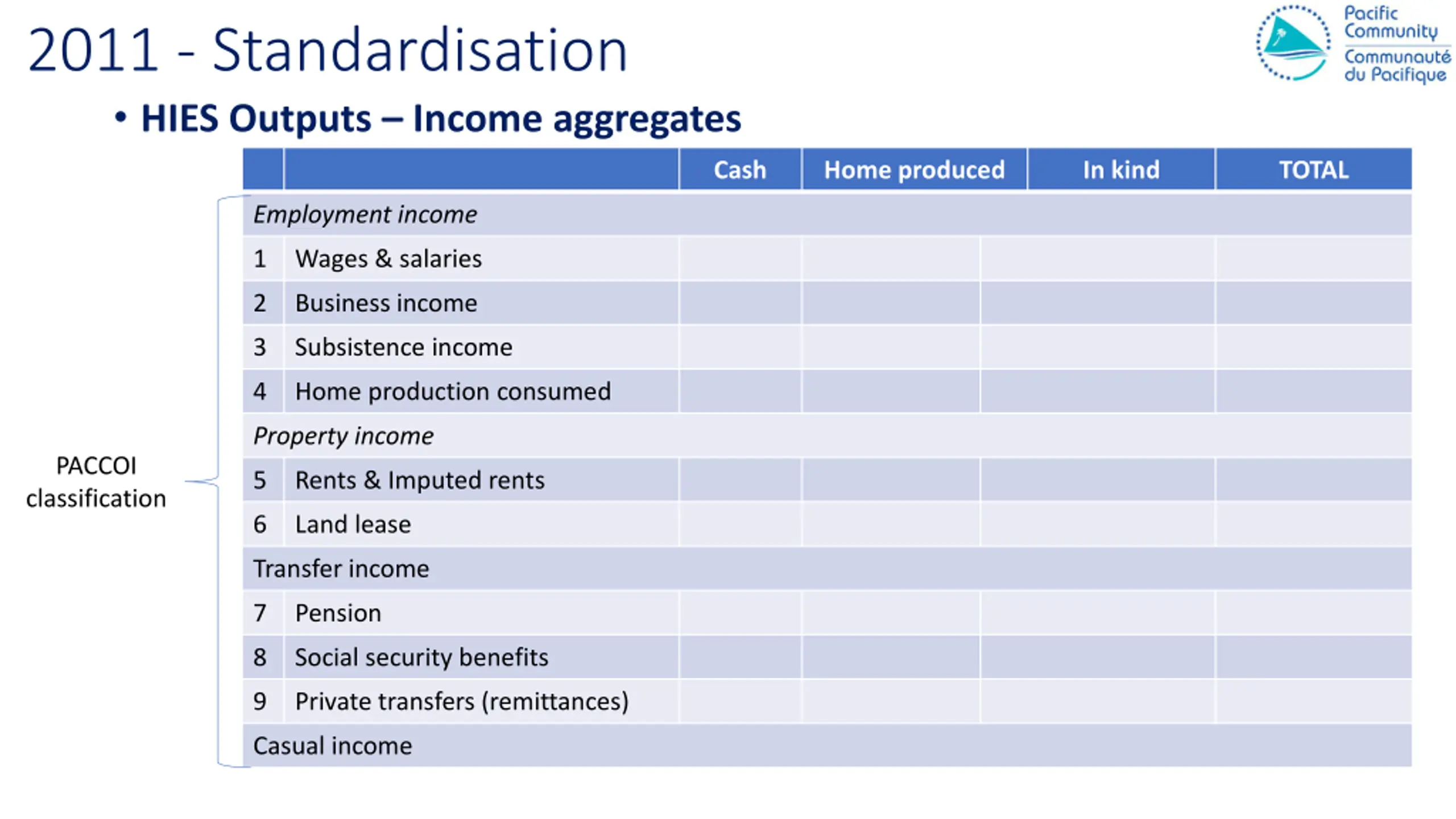 2011 - Standardisation HIES Outputs Income aggregates Cash Home produced In kind TOTAL Employment income 1 Wages & salaries 2 Business income 3 Subsistence income 4 Home production consumed Property income PACCOI classification 5 Rents & Imputed rents 6 Land lease Transfer income 7 Pension 8 Social security benefits 9 Private transfers (remittances) Casual income