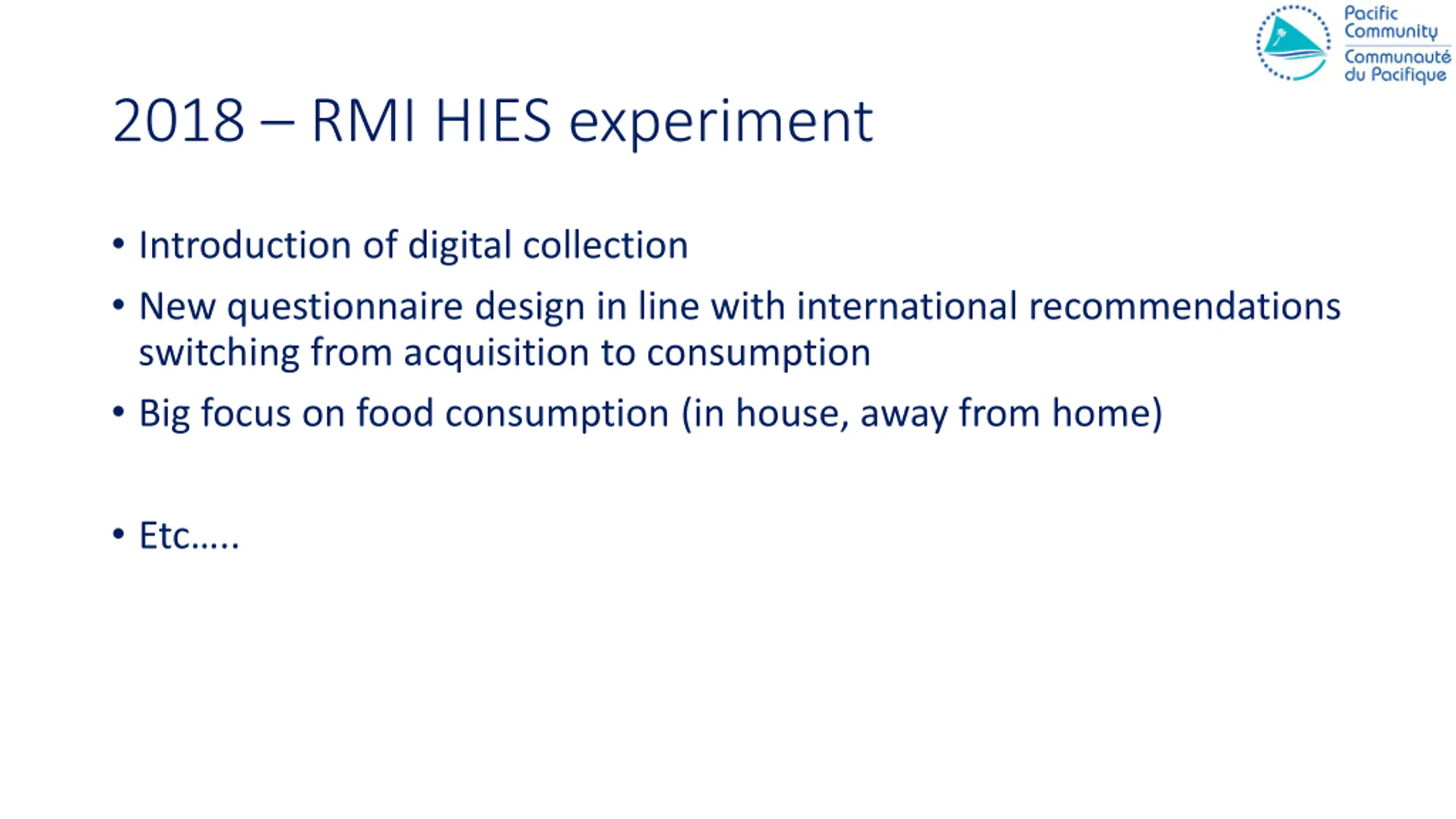2018 RMI HIES experiment Introduction of digital collection New questionnaire design in line with international recommendations switching from acquisition to consumption Big focus on food consumption (in house, away from home) Etc ..