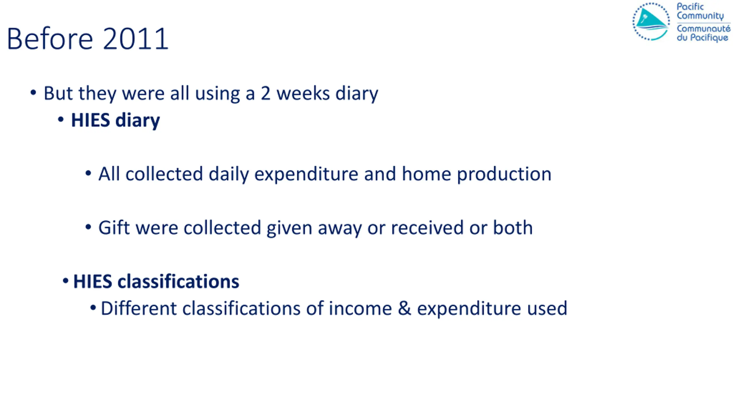 Before 2011 But they were all using a 2 weeks diary HIES diary All collected daily expenditure and home production Gift were collected given away or received or both HIES classifications Different classifications of income & expenditure used