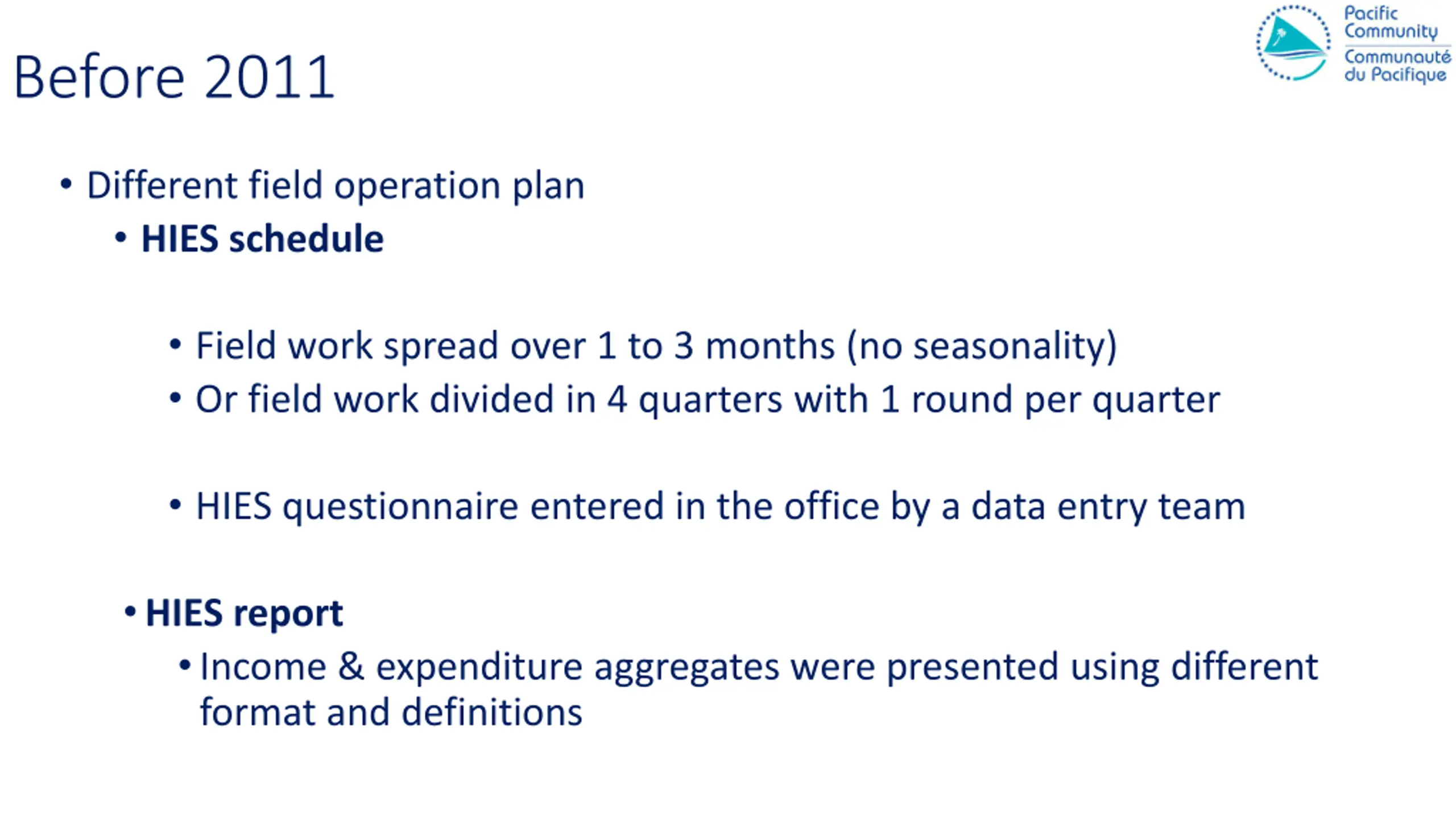 Before 2011 Different field operation plan HIES schedule Field work spread over 1 to 3 months (no seasonality) Or field work divided in 4 quarters with 1 round per quarter HIES questionnaire entered in the office by a data entry team HIES report Income & expenditure aggregates were presented using different format and definitions