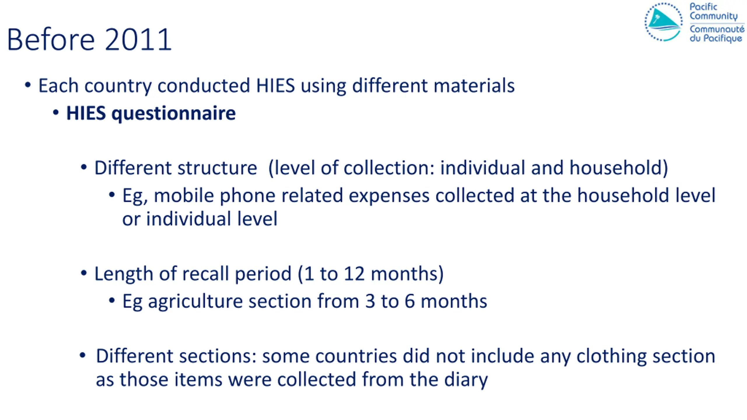 Before 2011 Each country conducted HIES using different materials HIES questionnaire Different structure (level of collection: individual and household) Eg, mobile phone related expenses collected at the household level or individual level Length of recall period (1 to 12 months) Eg agriculture section from 3 to 6 months Different sections: some countries did not include any clothing section as those items were collected from the diary