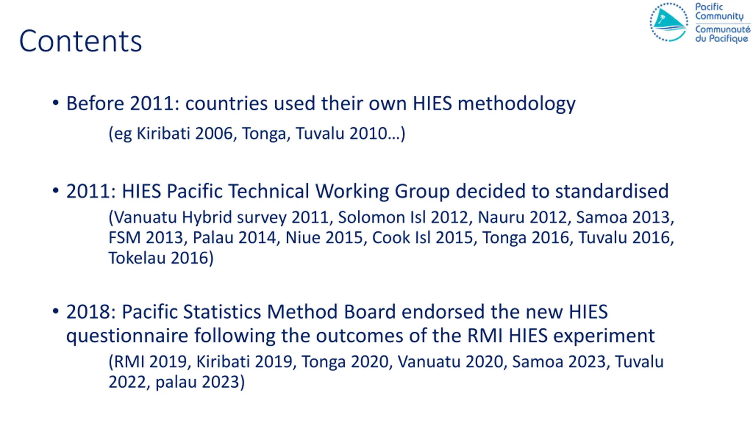 Contents Before 2011: countries used their own HIES methodology (eg Kiribati 2006, Tonga, Tuvalu 2010 ) 2011: HIES Pacific Technical Working Group decided to standardised (Vanuatu Hybrid survey 2011, Solomon Isl 2012, Nauru 2012, Samoa 2013, FSM 2013, Palau 2014, Niue 2015, Cook Isl 2015, Tonga 2016, Tuvalu 2016, Tokelau 2016) 2018: Pacific Statistics Method Board endorsed the new HIES questionnaire following the outcomes of the RMI HIES experiment (RMI 2019, Kiribati 2019, Tonga 2020, Vanuatu 2020, Samoa 2023, Tuvalu 2022, palau 2023)