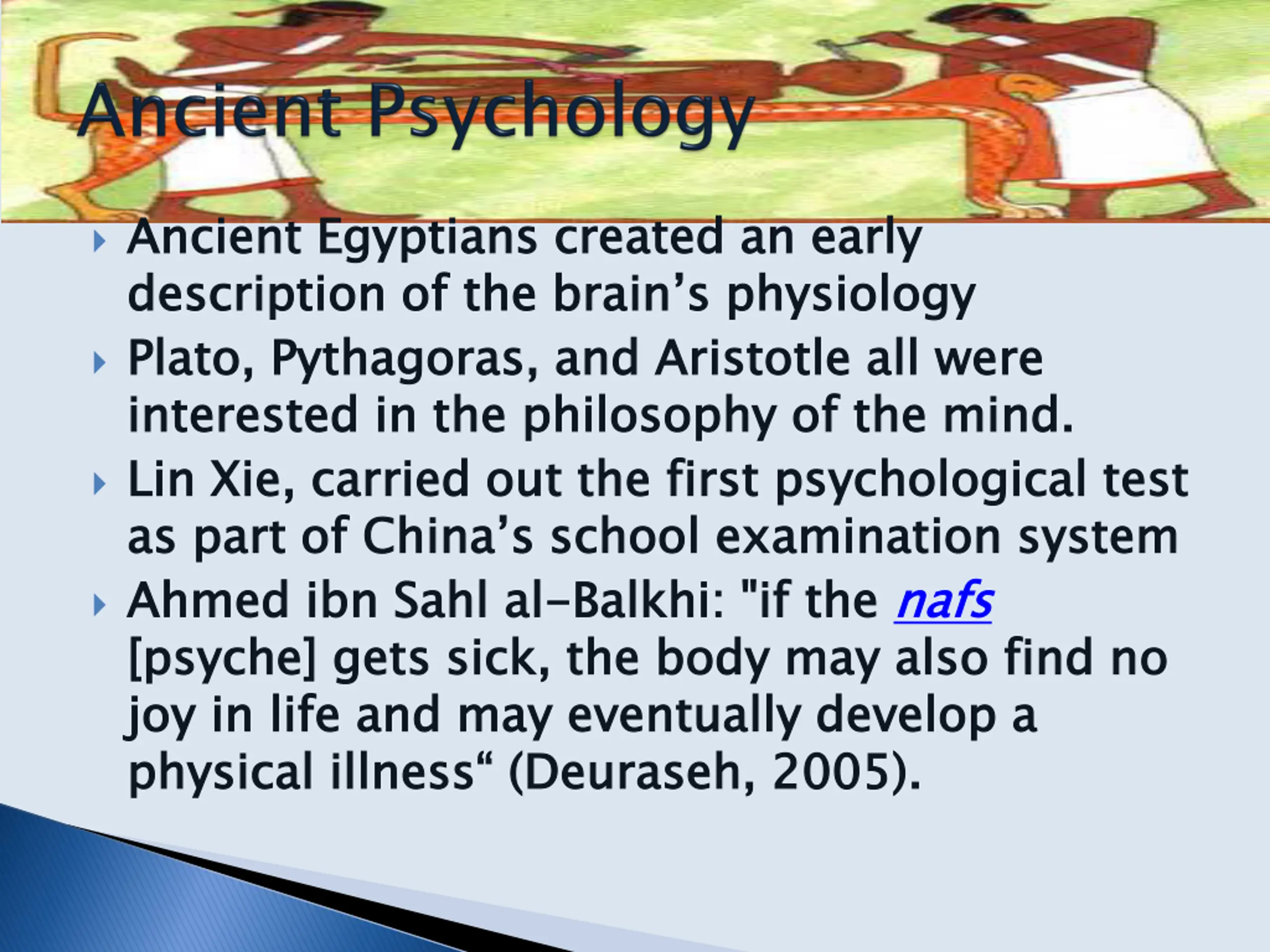 Ancient Egyptians created an early description of the brain s physiology Plato, Pythagoras, and Aristotle all were interested in the philosophy of the mind. Lin as part of China s school examination system Ahmed [psyche] gets sick, the body may also find no joy in life and may eventually develop a physical illness ( Ancient Egyptians created an early description of the brain s physiology Plato, Pythagoras, and Aristotle all were interested in the philosophy of the mind. Lin Xie as part of China s school examination system Ahmed ibn [psyche] gets sick, the body may also find no joy in life and may eventually develop a physical illness (Deuraseh Xie, carried out the first psychological test , carried out the first psychological test ibn Sahl Sahl al al- -Balkhi Balkhi: "if the : "if the nafs nafs Deuraseh, 2005). , 2005).