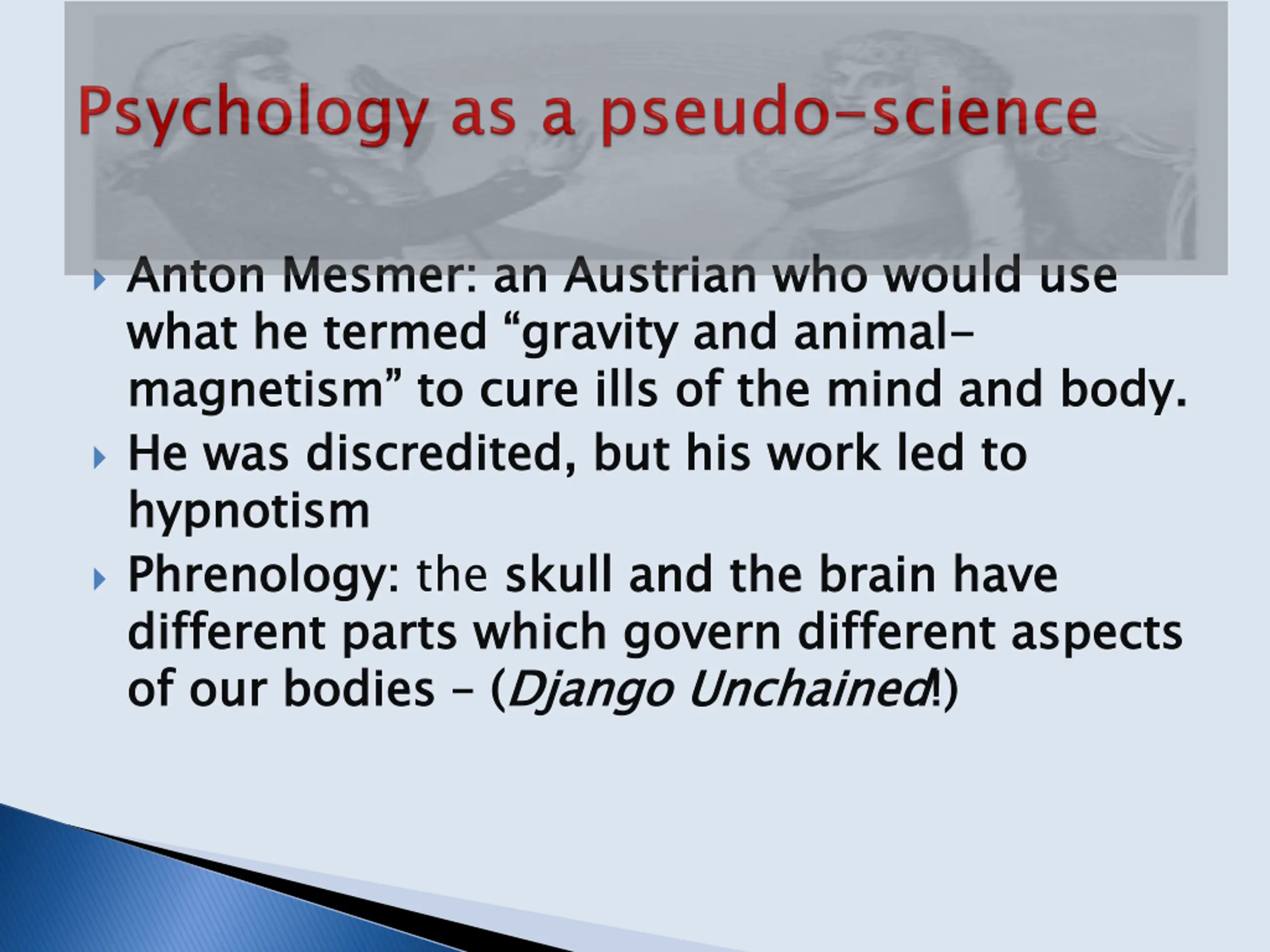 Anton Mesmer: an Austrian who would use what he termed gravity and animal magnetism to cure ills of the mind and body. He was discredited, but his work led to hypnotism Phrenology: different parts which govern different aspects of our bodies Anton Mesmer: an Austrian who would use what he termed gravity and animal- - magnetism to cure ills of the mind and body. He was discredited, but his work led to hypnotism Phrenology: the skull and the brain have different parts which govern different aspects of our bodies ( (Django skull and the brain have Django Unchained Unchained!) !)