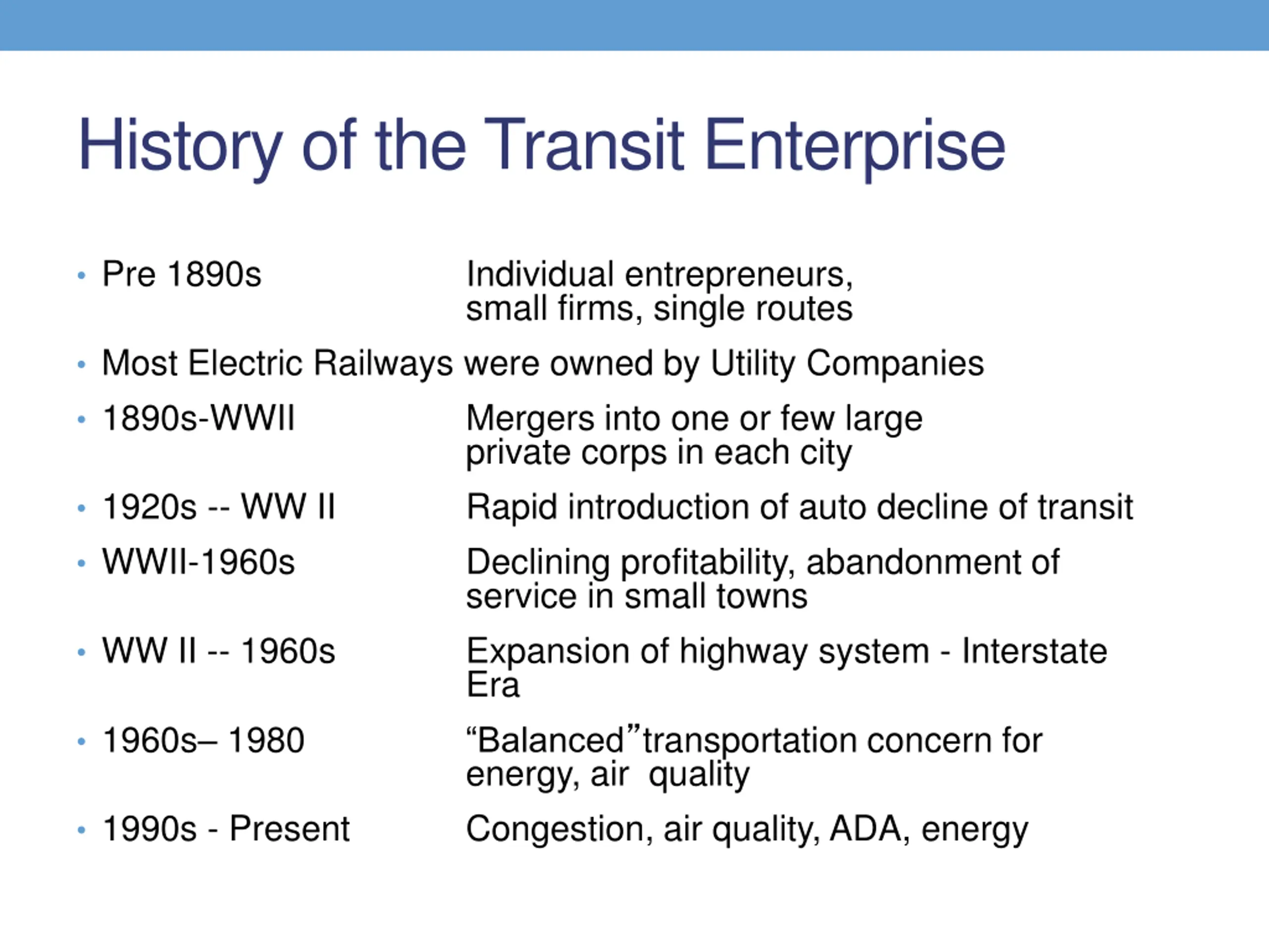 History of the Transit Enterprise Pre 1890s Individual entrepreneurs, small firms, single routes Most Electric Railways were owned by Utility Companies 1890s-WWII Mergers into one or few large private corps in each city 1920s -- WW II Rapid introduction of auto decline of transit WWII-1960s Declining profitability, abandonment of service in small towns WW II -- 1960s Expansion of highway system - Interstate Era 1960s 1980 Balanced transportation concern for energy, air quality 1990s - Present Congestion, air quality, ADA, energy
