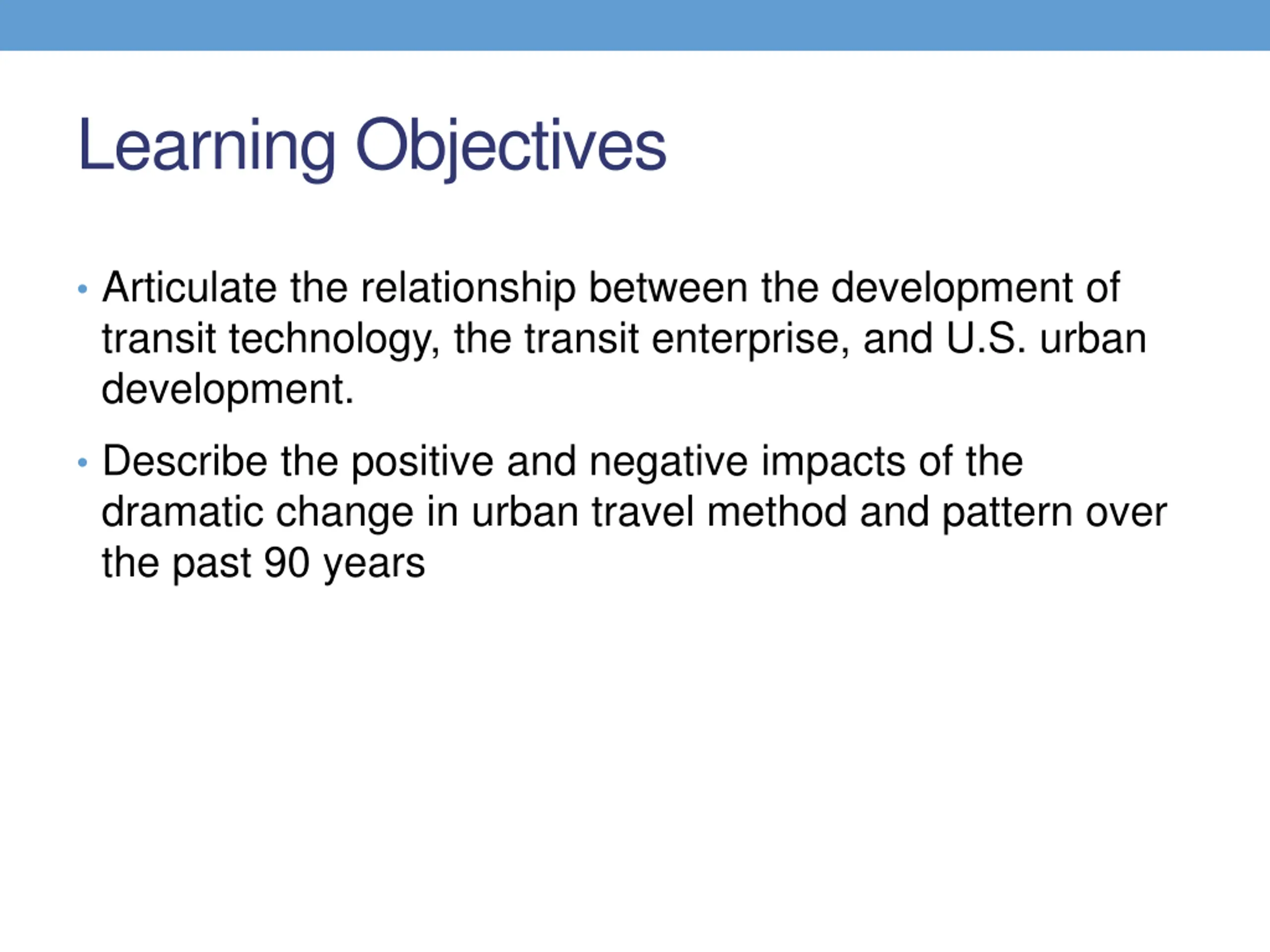 Learning Objectives Articulate the relationship between the development of transit technology, the transit enterprise, and U.S. urban development. Describe the positive and negative impacts of the dramatic change in urban travel method and pattern over the past 90 years